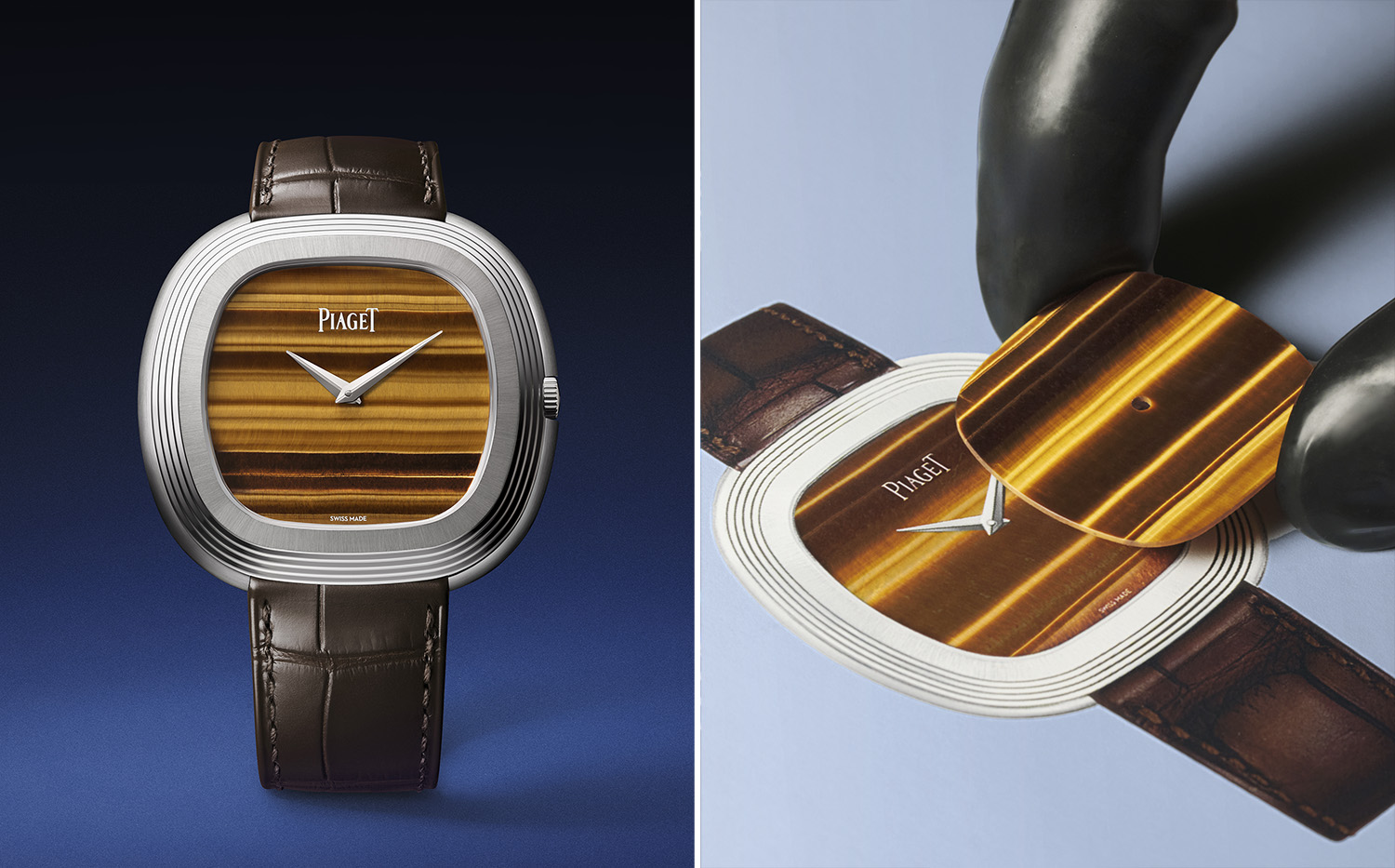 多年来,伯爵始终对装饰宝石青睐有加,去年问世的蓝色陨石表盘安迪·沃霍尔巴黎钉纹腕表便是典范之一。新款安迪·沃霍尔腕表表盘以虎眼石打造而成,搭载品牌自制501P1自动上链机芯。虎眼石表面光洁丝滑,其色泽饱和浓郁,自带深邃的橙褐色调。而新作表盘上的虎眼石经过精准切割,细腻的金色纹理愈显分明,天然的条纹图案与乳白光泽交融辉映、相得益彰。