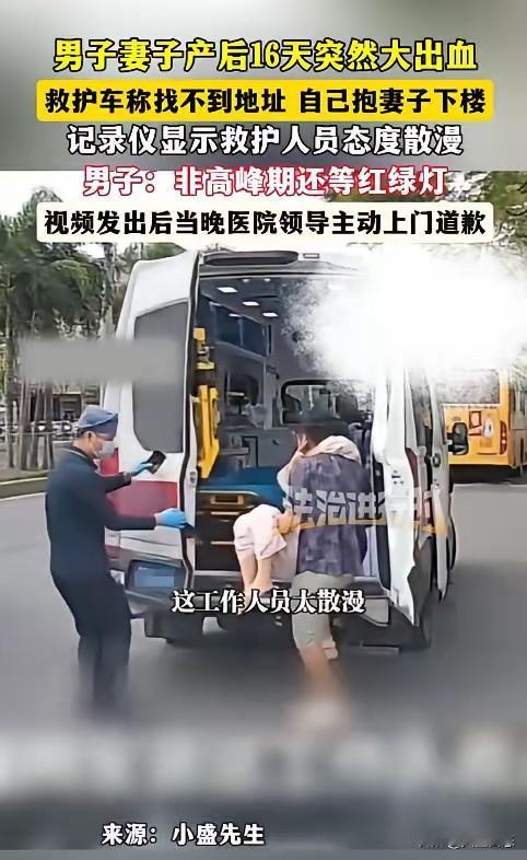 盛先生抱着妻子等救护车,司机找不到路,护士站着不动 那天在深圳一个小区里,盛先生的太太产后第十六天突然大出血,他赶紧拨打急救电话,但司机说找不到地址,没办法,他自己抱着人往小区门口走,救护车到了以后,两名医护人员动作很慢,车门只开了一半,没有人上前帮忙抬人。 这件事传到网上后,医院领导当晚就上门向盛先生道了歉,但大家心里都在想,如果盛先生自己没有冲出来,他还有没有机会被救回来,救护车本来有闯红灯的特权,但这特权没用在真正需要的地方,司机连小区里的路都搞不清楚,也没有提前查好地图,这说明调度系统和城市数据根本没接上。 更让人想不通的是那两个护士的行为,黄金抢救时间分秒必争,他们却站在那里不动,这不是技术上的问题,而是态度上的问题,网友对这件事议论纷纷,说这不像是在救人,倒像是在看热闹,现在国内很多地方考核急救车到达需要几分钟,可没人管到了现场医护人员干不干活,现有规定里,护士站着不动算不算违规,这个问题谁也说不清楚。 深圳一直被称为智慧城市,但打120急救电话时还得靠人自己说出地址,小区门禁和楼栋位置都没连上系统,就像拿着智能手机却还在用拨号上网那样落后,杭州前年也出过差不多的事,最后那家单位被停了资质,上海去年推出“三分钟到场”的措施,但落实情况没人公开,让人担心深圳是不是又在走别人的老路。 产后大出血最危险的是头两天,但盛先生的妻子拖到第十六天才出状况,这说明出院后可能缺乏跟踪服务,社区医院随访经常只是简单登记填表,没有持续评估风险,这次事件可能只是暴露了问题的表面,还有更多产妇在默默承受这些隐患。 这段视频在11月18日公开,到现在还没有看到官方发布处理结果,医院领导已经来道过歉,但光道歉解决不了问题,大家真正关心的是,如果以后再发生类似事件,到底由谁来实际负责。 盛医生 深圳救护车