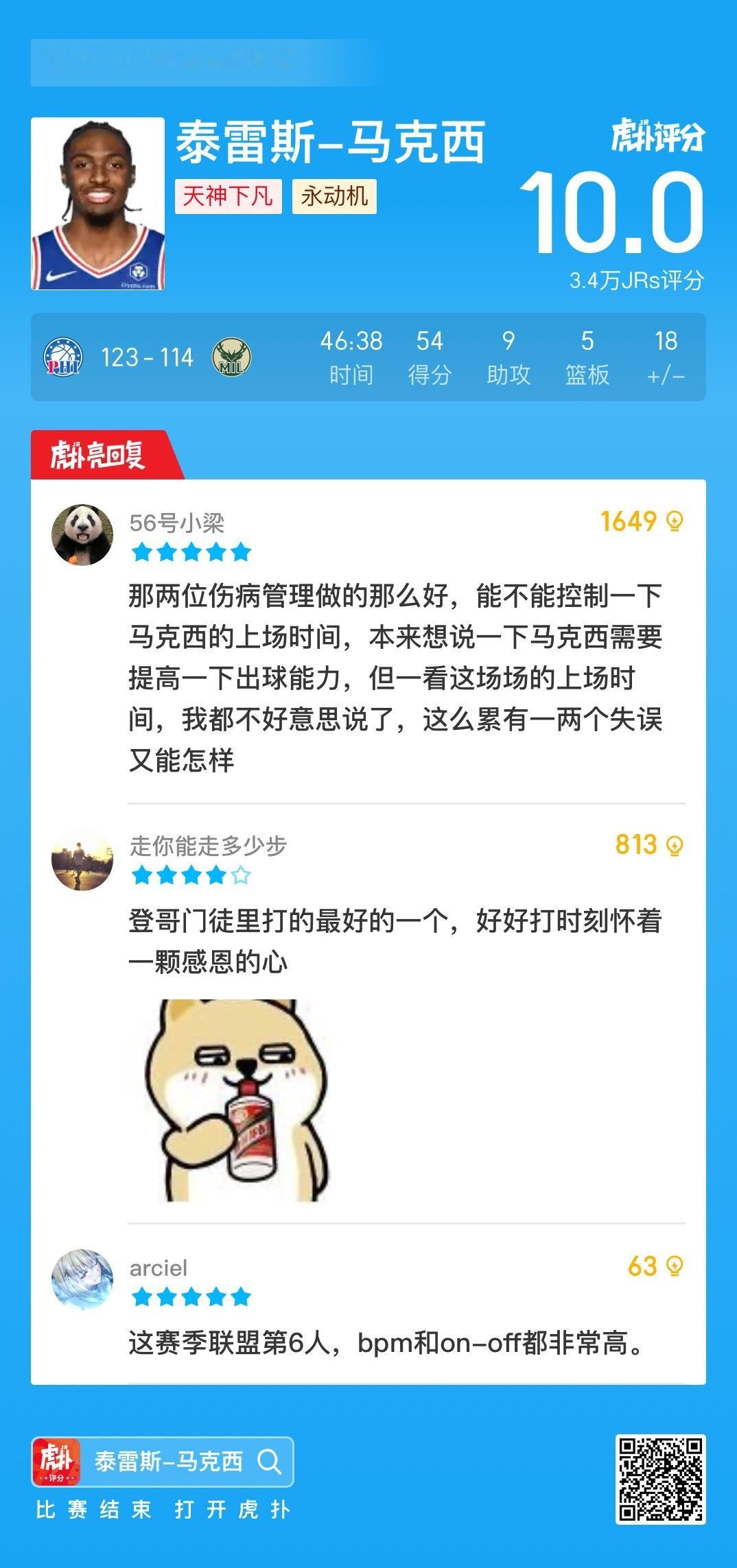 生涯新高!马克西全场30投18中,狂砍54分5板9助3抢断3盖帽NBA常规赛,76人对阵雄鹿的全场比赛已结束,76人123-114战胜雄鹿。76人球员泰雷斯-马克西全场出战47分钟,30投18中、三分15中6、罚球14中12得到54分5篮板9助攻3抢断3盖帽。
