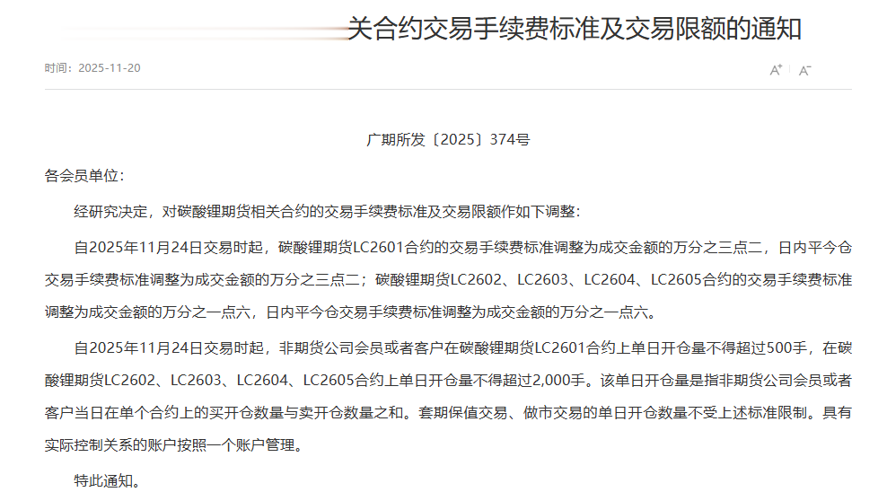 自2025年11月24日交易时起,非期货公司会员或者客户在碳酸锂期货LC2601合约上单日开仓量不得超过500手,在碳酸锂期货LC2602、LC2603、LC2604、LC2605合约上单日开仓量不得超过2000手。