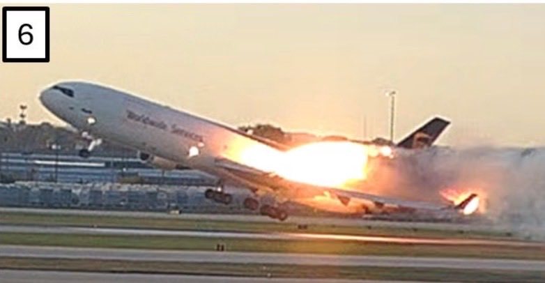 NTSB发了UPS货运MD-11F坠机事故的初步报告,附上了更关键阶段的监控画面,果然是左侧1号发动机吊架断裂,发动机短舱直接向上掰断飞走了,找到的残骸显示确实是疲劳断裂了。这简直和几十年前芝加哥空难中美国航空DC-10(MD-11的前身)一个死法,当时是机务图省事不按厂家流程拆装发动机,吊架磕了个裂纹然后积累直到断裂,也是起飞时左发脱落然后扯坏液压导致失控。仔细看能发现左右尾部的2号发动机也出现了喷火的迹象,原因可能是气流扰动/机翼泄露燃油吸入造成的喘振,或者飞散的碎片进入了2发射进气道打坏了叶片。三发布局本来是有利于提高冗余的,结果运气太差了根本没发挥作用。总之,这架装着大量燃油和沉重货物执行远程航班的飞机刚刚离开地面,就只剩下一台发动机可以正常提供推力,此时既无法停下,也根本不可能爬升,极大的推力不均让保持平衡都做不到,在超低空根本无法避开前方建筑,简直是无解的必死局。MD-11系列的机翼比较靠后,远在机头的飞行员可能从始至终都没看到后面到底发生了什么,只是突然一阵震动然后仪表一片红色警告,手上操纵杆逐渐失效……