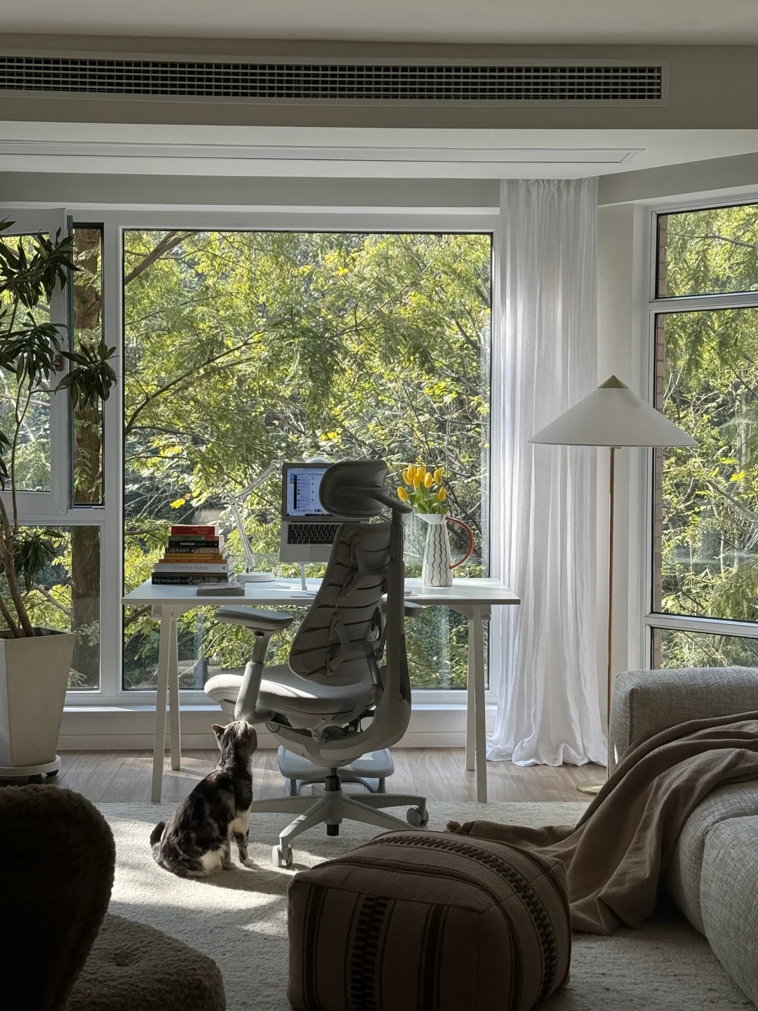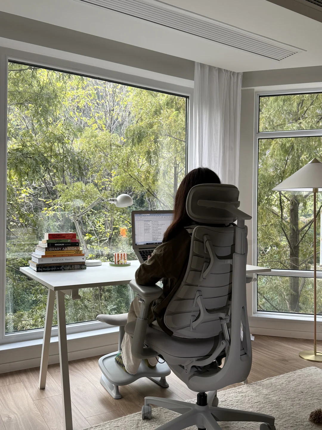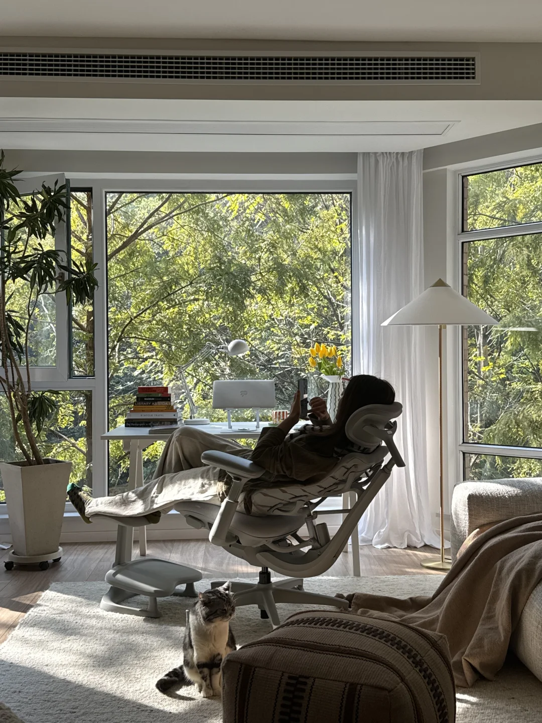 三年前搬到这里,就盼望“窗含青黛色,案有笔墨香”的模样,如今最爱的角落—客厅落地窗前的书桌。而撑起这份惬意的就是清闲这把动态人机工学椅。