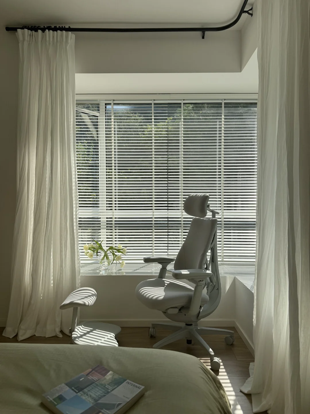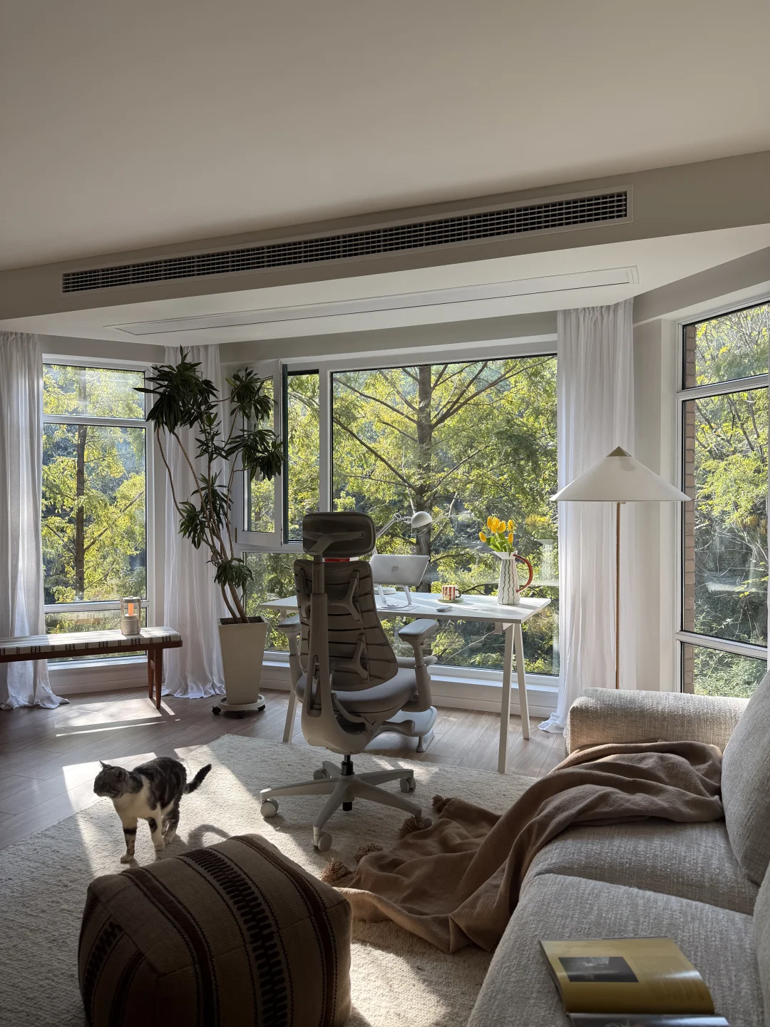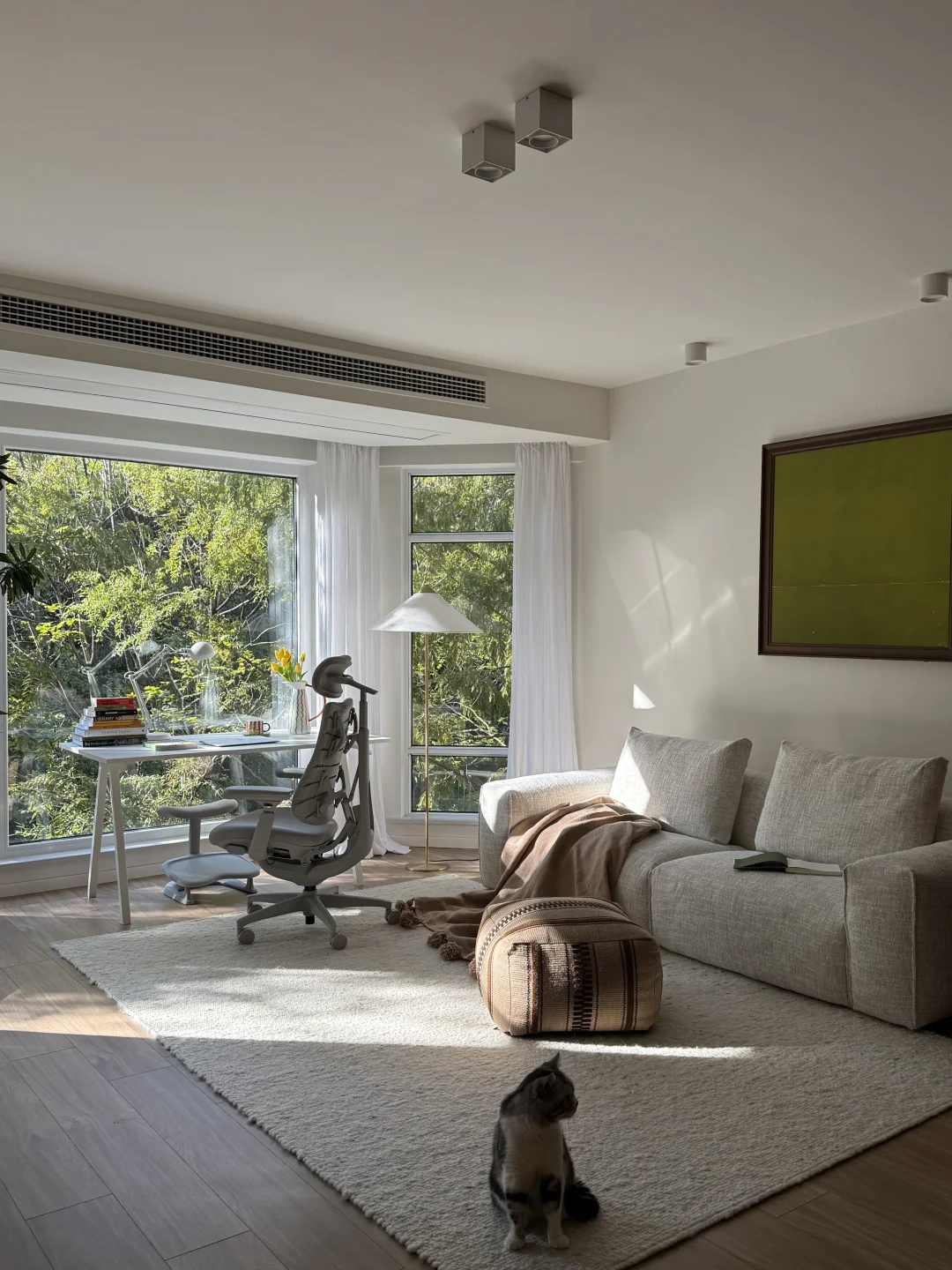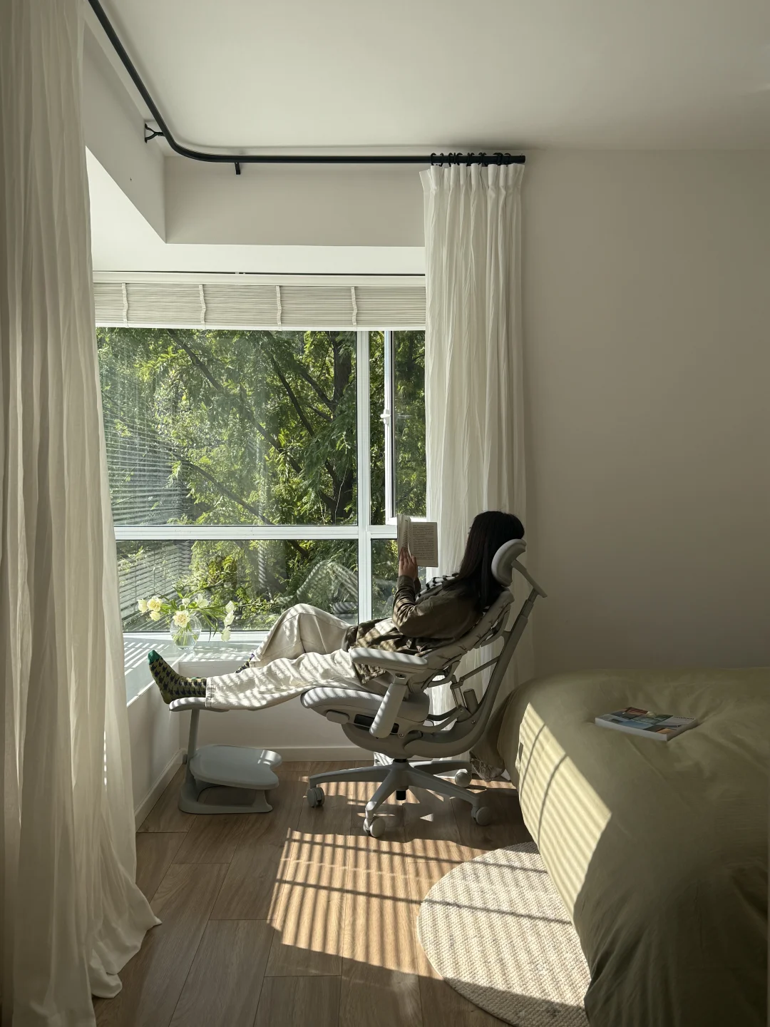 三年前搬到这里,就盼望“窗含青黛色,案有笔墨香”的模样,如今最爱的角落—客厅落地窗前的书桌。而撑起这份惬意的就是清闲这把动态人机工学椅。