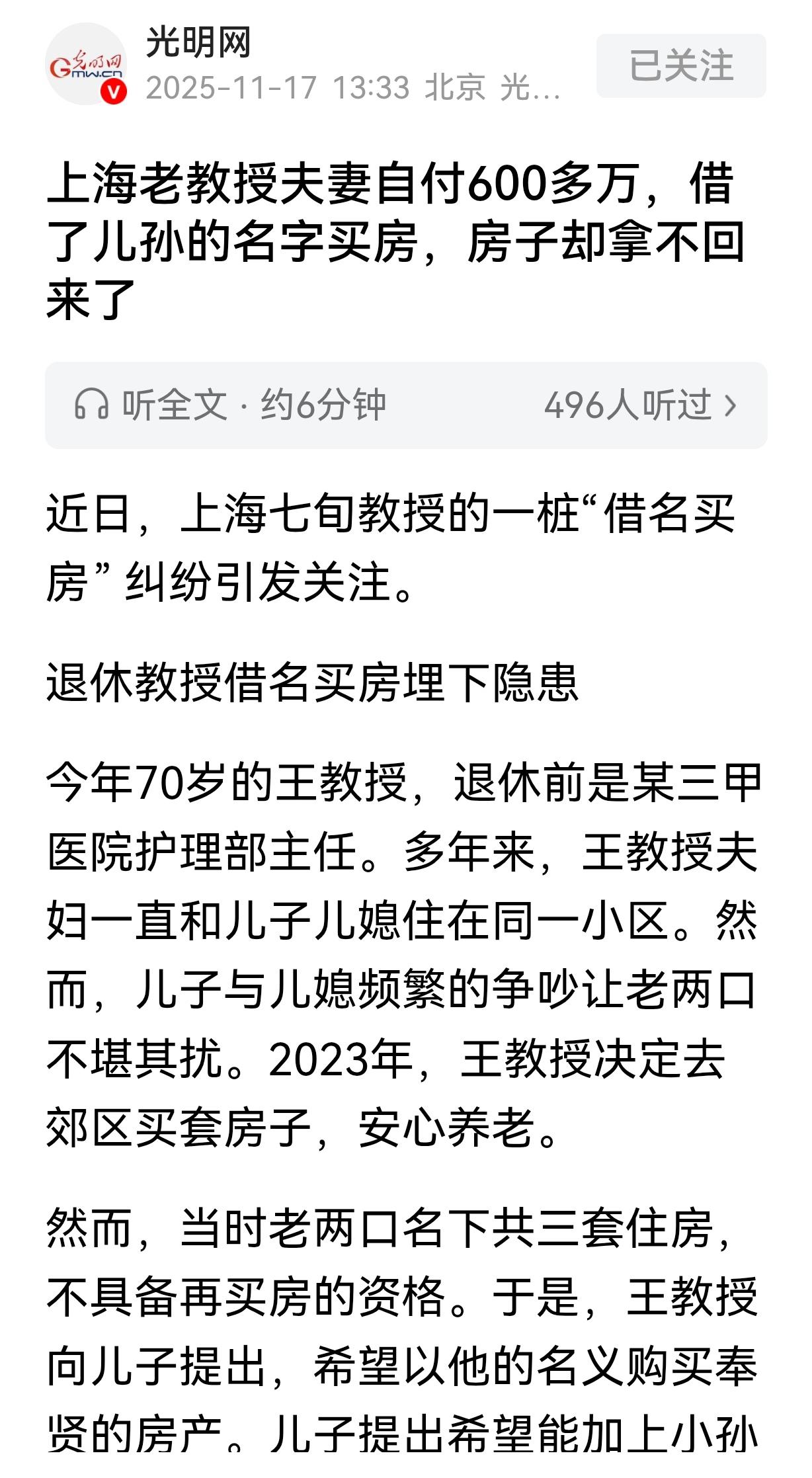上海,一70岁大爷是退休教授,他想花600多万买房养老,但因他名下有3套房,没买房资格,就想用儿子名义买房,儿子却提出为了让他老婆高兴,得加上自己女儿名字,大爷同意了,房子买了后,大爷准备过户到自己名下,儿媳妇却突然变脸,说这房子是大爷赠予儿孙的,大爷愤怒的把儿子、小孙女、儿媳告上法庭,案子经过2审,最后陷入僵局。 上海奉贤的一套别墅里,70岁的王教授看着窗外的绿化,心里却比如今初冬的冷风还凉。 曾经盼着在这里安度晚年的养老房,如今让整个家支离破碎,老伴因为房产归属跟他闹离婚,儿子儿媳也走到婚姻尽头,就连一手带大的大孙女,都在法庭上站到了他们老两口的对立面。 这一切的根源,都是那套他和老伴倾尽积蓄买下的房子。 王教授退休之后,和自己的儿子儿媳同住一个小区,他们两个常年争吵不断,每次争执后儿媳都会上门倾诉,搅得老两口不得安宁。 为了避开这些纷争,老两口打定主意搬到郊区,买一套环境清静的别墅。 可真要买房时,一道坎横了过来,他们名下已有三套住房,受上海限购政策影响,没法直接办理购房手续。 思来想去,王教授只能找儿子商量,希望借用儿子的名义购房。 儿子听后没多犹豫就答应了,但紧接着提出一个附加要求,要把年幼的小孙女名字也加在购房合同上,说是这样能让妻子更有安全感。 王教授当时觉得都是至亲骨肉,没必要分得太细,没做过多考量就点头同意。那会儿选中的房子还在建设中,属于期房,购房合同上最终写了儿子和小孙女的名字,谁也没预料到这个决定会埋下隐患。 2025年年初,别墅终于交付使用。 王教授老两口卖掉了市区的两套住房,顺利搬进了新家, 为了尽快把房产过户到自己名下,他们立刻和儿子一起去公证处办理了《借名买房协议》,白纸黑字写明房屋由老两口全额出资,儿子只是挂名。 可到了不动产登记中心办理过户时,意外发生了,作为小孙女监护人的儿媳,拒绝签下借名协议,声称这个房子已经是王教授送给儿子和小孙女的。 多次沟通无果后,王教授只能选择起诉,将儿子、儿媳和小孙女一同告上法庭,他坚信自己手握全额付款凭证和公证协议,胜诉应该十拿九稳。 但一审判决结果却给了他沉重一击。 法院在审理中,提取到他与大孙女的微信聊天记录,其中一句“奉贤这套房我们住十几年后,就留给你爸和你妹”,被认定存在赠与的意思表示。 再结合房产登记在儿子和小孙女名下的事实,法院最终判定房屋属于赠与,驳回了王教授的过户请求。 让王教授更无法接受的是,法院在审理时,没有将老伴列为案件当事人,直接把这套老两口共同出资的房产定性为他的个人财产。 这个认定让老伴极为愤怒,两人爆发了结婚以来最激烈的争吵,老伴甚至激动地提出要离婚。 不甘心的王教授随即提起上诉,中级法院为了化解矛盾,组织了多次调解,提出让王教授和小孙女各占一半产权的方案。 王教授起初坚决反对,认为自己全款购房不该只获一半权益。 后来为了平息家庭矛盾,老两口退让一步,提出愿意将5%的产权赠给小孙女,还承诺日后会给她留其他财产,前提是孩子要孝顺懂事。 即便如此,儿媳依然拒绝签字,调解最终失败。 从法律层面来看,法院的一审判决并非没有依据,不动产产权归属通常以登记为准,这是最直接的认定依据。 王教授的借名协议签订时间在购房之后,证明效力本就弱于购房时的登记信息,而那句微信聊天记录又成为了赠与意图的关键佐证。 另外,根据《民法典》相关规定,监护人有义务保护未成年人的财产权益,儿媳以保护小孙女财产为由拒绝签字,也符合法律对监护人职责的要求。 回头看各方的心态,王教授最初的妥协源于对亲情的信任,觉得家人之间不必计较太多形式。 儿子提出加女儿名字,或许是想平衡家庭关系,没考虑到后续风险,儿媳的强硬态度,大概率是看到房产登记在自家孩子名下,不愿放弃这份实际利益。 最让老两口心寒的大孙女,年纪尚轻,很可能是受父母影响,或是真的误解了爷爷奶奶要“抢房”的举动,才在法庭上做出那样的陈述。 熟悉这事的亲友邻居,都替老两口不值,一辈子攒下的血汗钱,本是为了换个清静晚年,没成想房没保住,亲情也变得面目全非。 这种借名买房引发的纠纷,在限购严格的大城市并不少见。 很多人觉得亲人之间知根知底,签不签协议、手续全不全无所谓,可一旦涉及到房产这种大额资产,光靠信任和口头约定根本靠不住。 目前,王教授的案子还在二审审理中,最终结果尚未可知。 一套价值六百万的房子固然珍贵,可比起几十年的骨肉亲情,终究是身外之物。