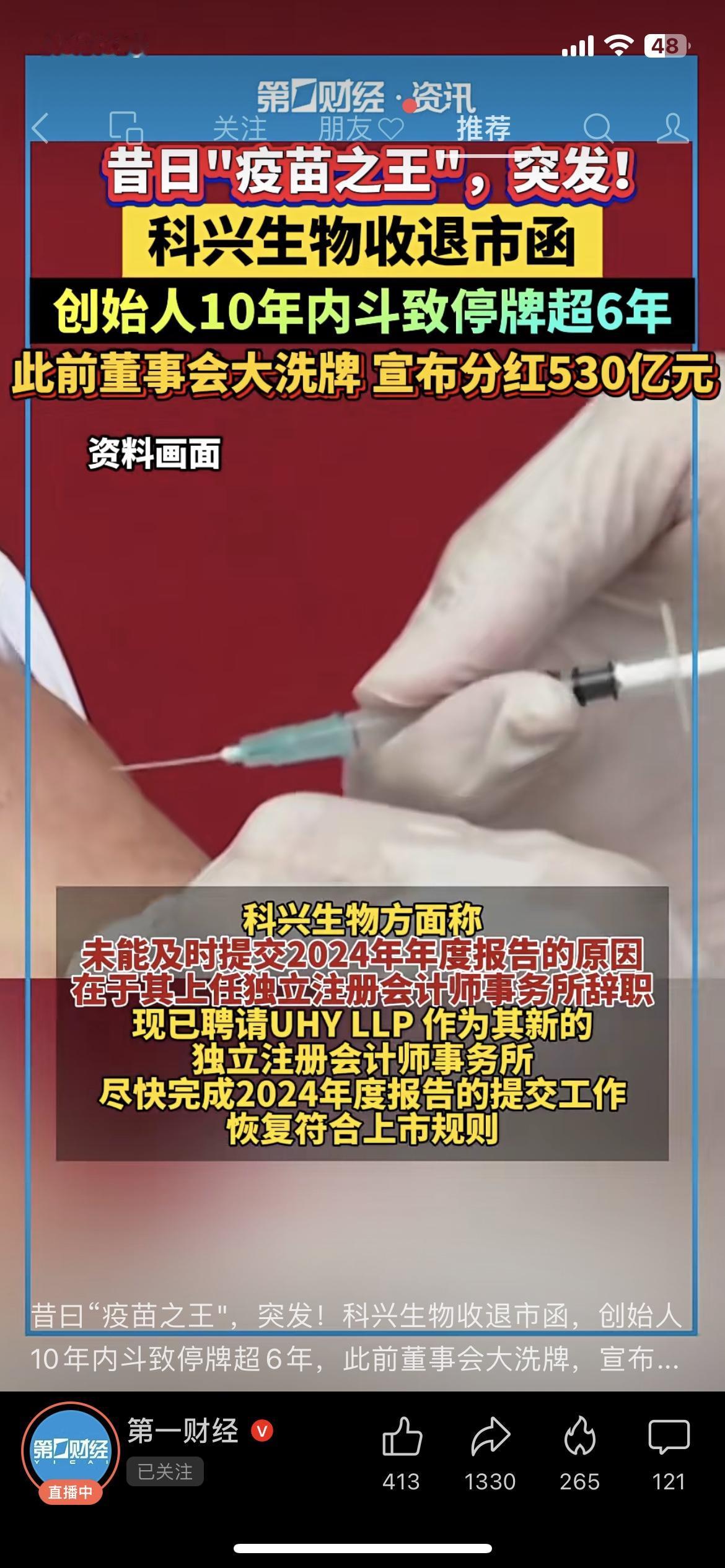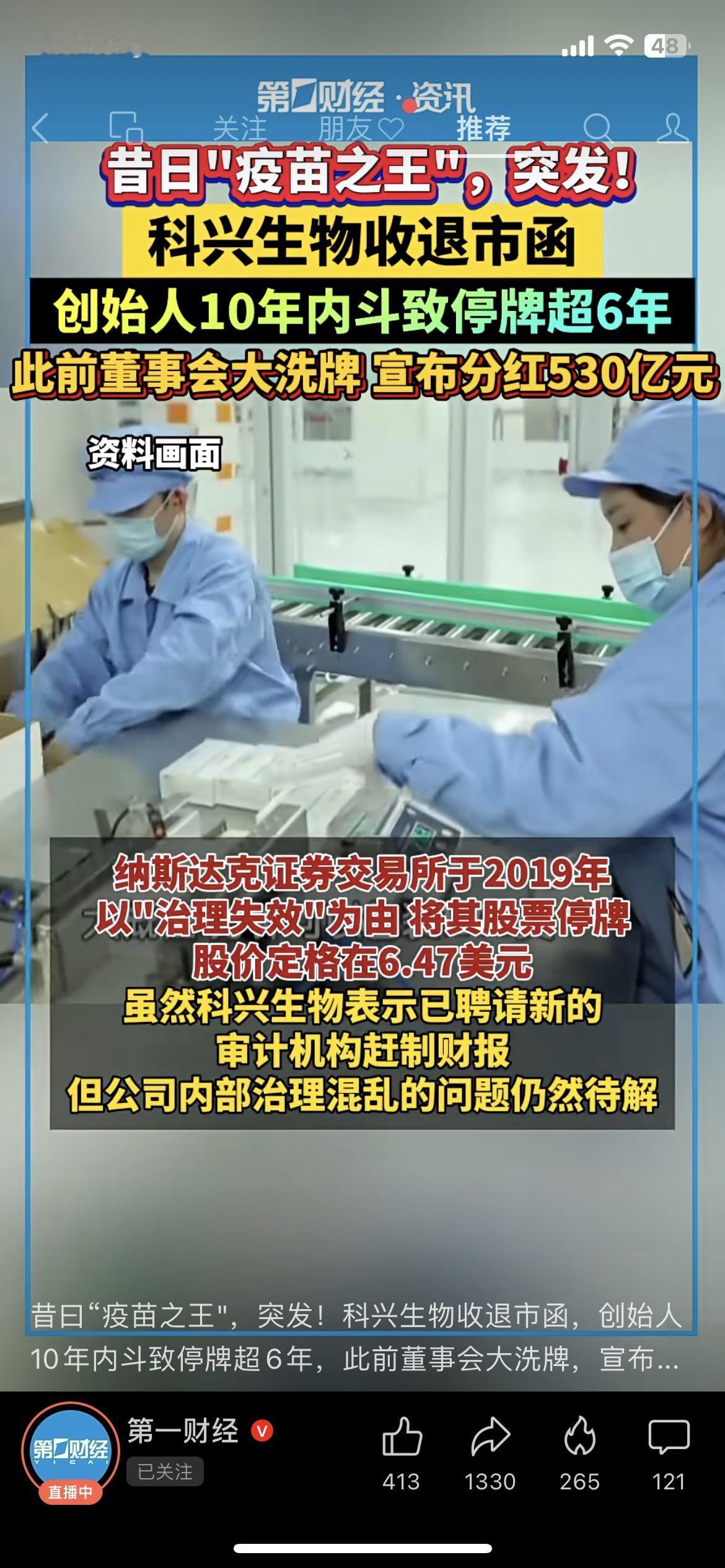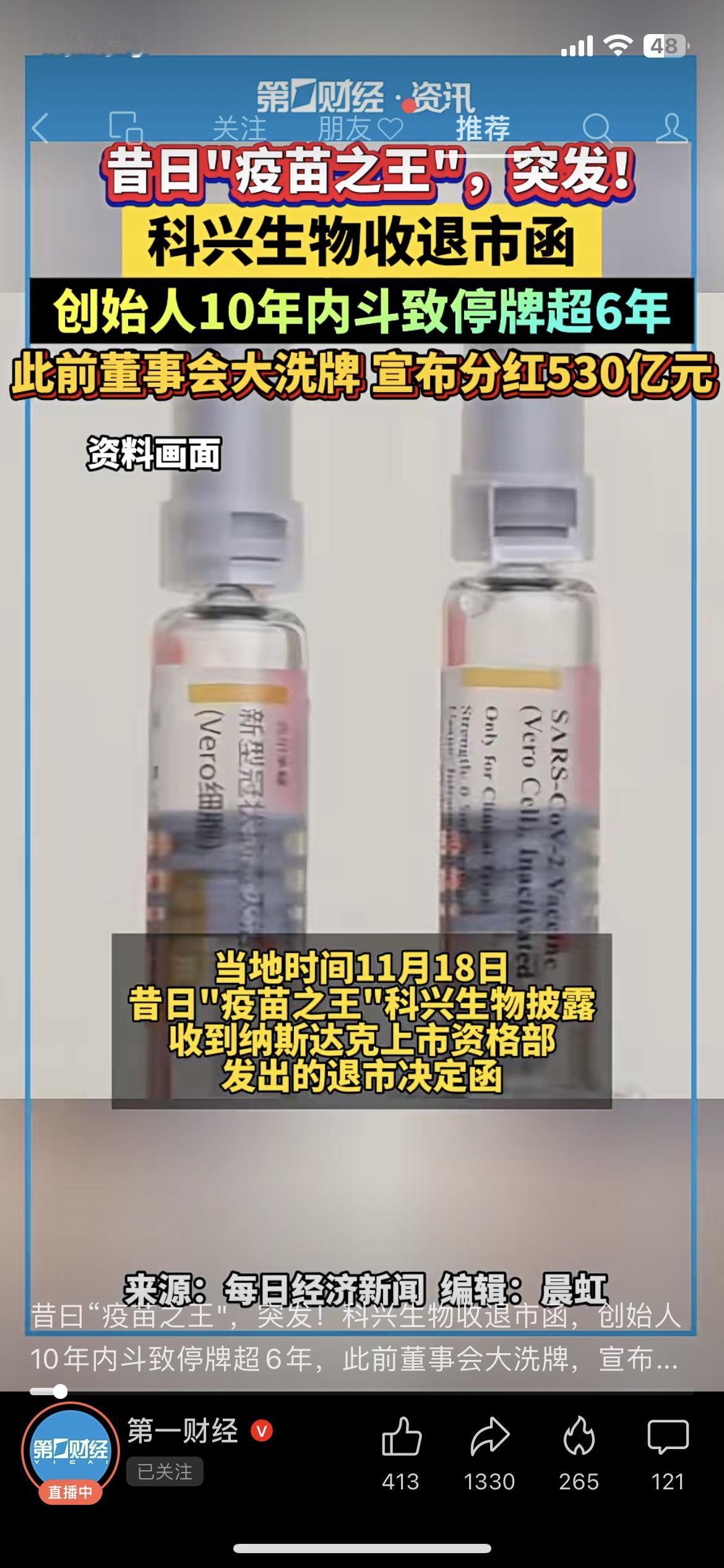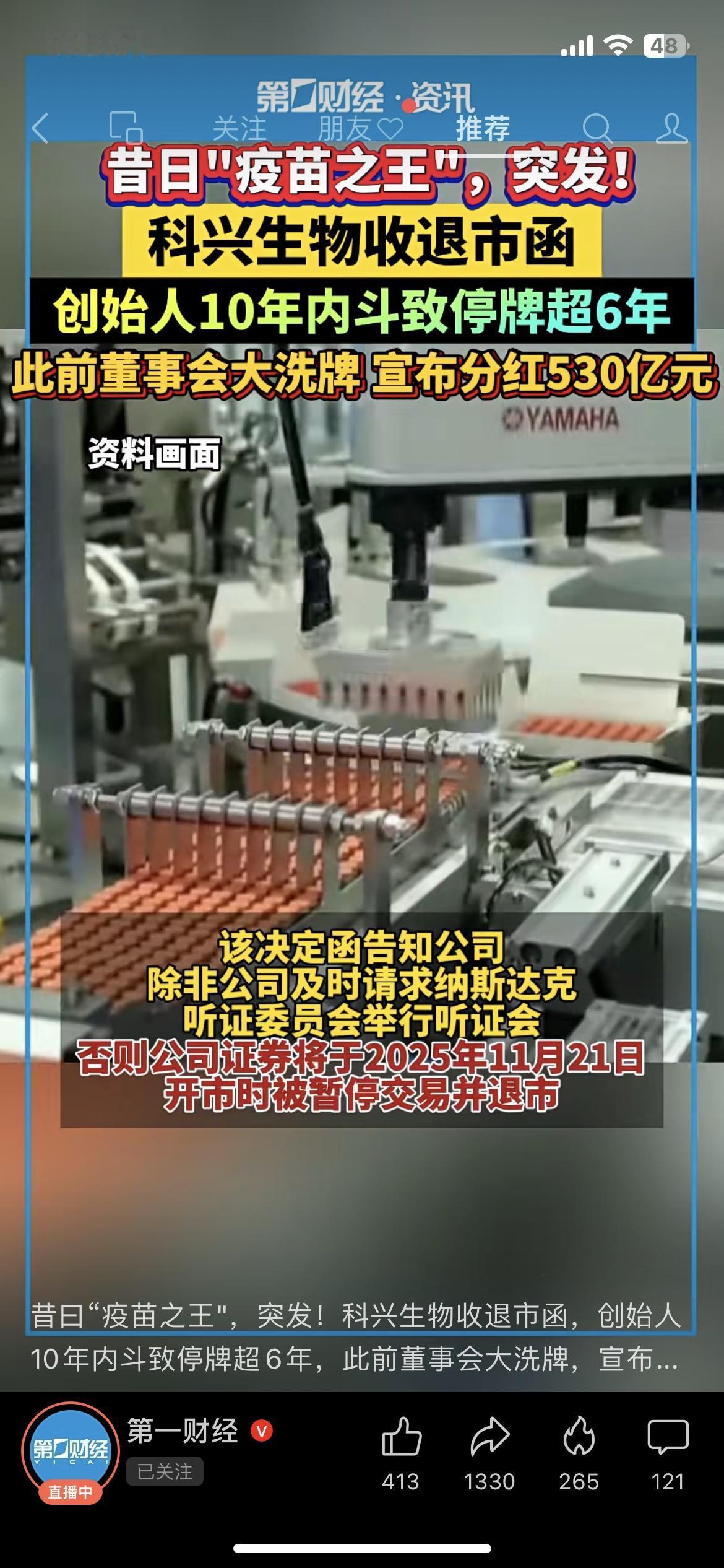 🔥昔日“疫苗之王”凉了?科兴生物收退市函!10年内斗抢公章、占厂房,停摆6年还分红530亿… 谁能想到,曾靠新冠疫苗火遍全球的科兴生物,如今要从纳斯达克退市了! 11月18日刚收退市函,根源是10年没停过的创始人内斗——尹卫东、潘爱华两派抢公章、占厂房、剪电线,把公司搅得一团糟。 2019年就因“治理失效”停牌,股价定格6.47美元;现在连2024年报都交不出来,新审计机构赶工也难救。 曾经的疫苗巨头,终究败给了自己人? 科兴生物退市 疫苗之王陨落疫苗