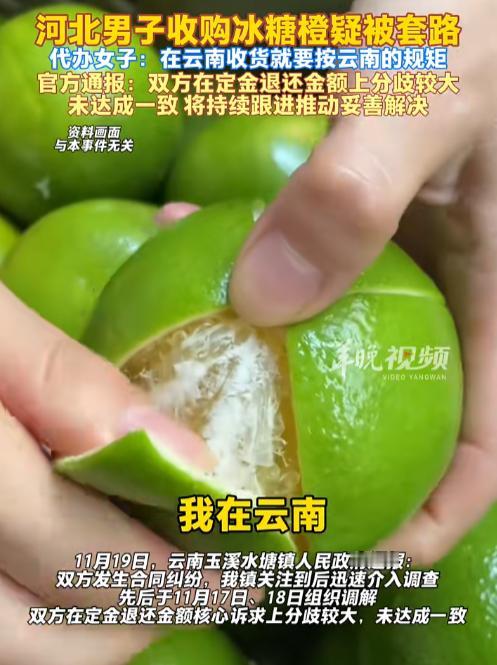 女子凭一己之力把果农干翻!11月20日报道,云南,男子收购冰糖橙,和女子说好要全黄的,可第二天到果园发现大半都是绿的,男子避免果农损失,称会收走摘下来的,其他不要了,但要女子把多余的空箱钱退了,女子不愿意,说他们那里果有点黄就是熟的了,男子来到他们地方就要按照他们的规矩来,要求男子懂得入乡随俗。 “哪里收货就按照哪里的规矩!难道我在云南,我要按照他河北的规矩办事吗?入乡随俗你懂不懂啊!” 河北做水果电商的李先生,信心满满跑了三千多公里,开车直奔云南,就是为了给客户挑一批“树熟、金黄、糖度13以上”的冰糖橙。 提前签了合同、付了5000元定金,还自己掏钱买了560个空筐,想着拉完就走,顺利返程,谁想到,真到了果园,人傻眼了:满地都是青得发亮的橙子,和微信里看到的黄果根本不是一回事。 李先生做的是线上零售,客户对品质要求高,他就托朋友联系到当地做代办的王大姐,王大姐发来的视频里,不光果子黄亮、挂满枝头,现场测糖仪一测,就是12-13度。 她还拍胸脯保证:“我们这边都是黄果收,青的绝对不摘。”旁边摘果工人也在附和,话说得把人稳稳安在心里。 李先生觉得靠谱,两人签了合同,写得清清楚楚,“全黄、糖度13以上”,连口说无凭都不用担心,钱付了,空筐订了,就等采收。 采果当天原本说好七点走,结果王大姐一拖再拖,磨到九点才愿意上山,刚进果园,李先生脑袋“嗡”一下:一百多筐橙子摆在眼前,七成都青得发亮,最多带点浅黄晕,糖度一测也就11多,根本达不到约定标准。 抬头一看,树上果都被摘光了,可不是什么“摘黄留绿”,而是“黄绿全摘”。 李先生憋着火找王大姐沟通,没想到人直接翻脸:“我们云南就是这规矩,你不了解就别来。果子有点黄就是熟了。”说得理直气壮。 李先生怕果农白忙活,也不想一闹就撕破脸,先退一步:“这样,我按定金金额挑一部分走,没用到的空筐钱你退给我,剩下的果你们自己处理。” 本以为算是体面收场,没料到王大姐一句话堵上来:“合同签了就得全收,来了就得按我们规矩,入乡随俗懂吗?” 这把李先生气得够呛:“尊重地方习惯是一回事,你当初保证的黄果呢?约定还能说变就变?”双方吵得不可开交,只能报警。 村委会和民警赶来调解,可王大姐态度死硬,寸步不让,更离谱的是,现场居然有人补一句:“褚橙要出国,不用别人来宣传。”这话传出去,被网友骂“听着就像地方保护”,现场矛盾彻底被放大。 行内人都懂,哀牢山确实有“带青采收、库内后熟”的做法,但那只适合长期合作、走冷库大批量的大买家,而且合同里要写明白。 李先生是网零电商,要的是树熟黄果,客户收到马上吃,不同渠道自然不同要求。 更关键,合同白纸黑字写着标准,代办说再多“地方规矩”,也不能顶替合同生效。 最终调解没谈成,李先生空车往回开,交通费、定金加空筐钱就这么砸水里。 他说不是舍不得钱,就是气憋得没地方出,现在已经准备起诉,也想提醒后来者,外地来收果,一定写明标准,关键条款不能只是嘴上说说。 这事上了热搜,网友吵翻了,有骂代办“拿地方规矩当幌子,实际上就是搞欺诈”的,也有人替整个产区担心,“一粒老鼠屎,坏了一锅汤”,还有人说得直接,做生意最看合同,事先说好的不能中途变脸。 当地部门很快发声,确认代办王某某言辞激烈、方式欠妥,造成不良影响,已经成立调处专班,开通专门绿色通道处理合同纠纷,希望尽快解决问题。 说到底,外地客商跑几千公里来收果,是给当地带生意、带长期市场,种果赚钱不容易,代办赚钱也不容易,可不管“地方习惯”还是“行业传统”,都得放在诚信和契约精神前面。 少数人不守规矩,不只是坑了一个李先生,更可能让整个产区好不容易打出来的口碑受损。 这事算是敲响了警钟:果子好是事实,品牌也积累多年,但市场已经不是“我说什么就是什么”的时代了。 做生意靠互信,挣钱靠长期, 一旦砸了名声,再想捡回来,可就难多了。 对此你怎么看? 信源:江西旅游广播