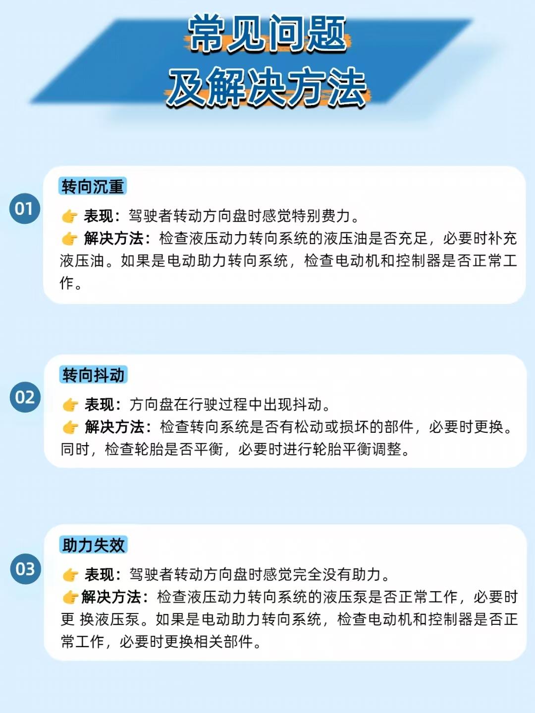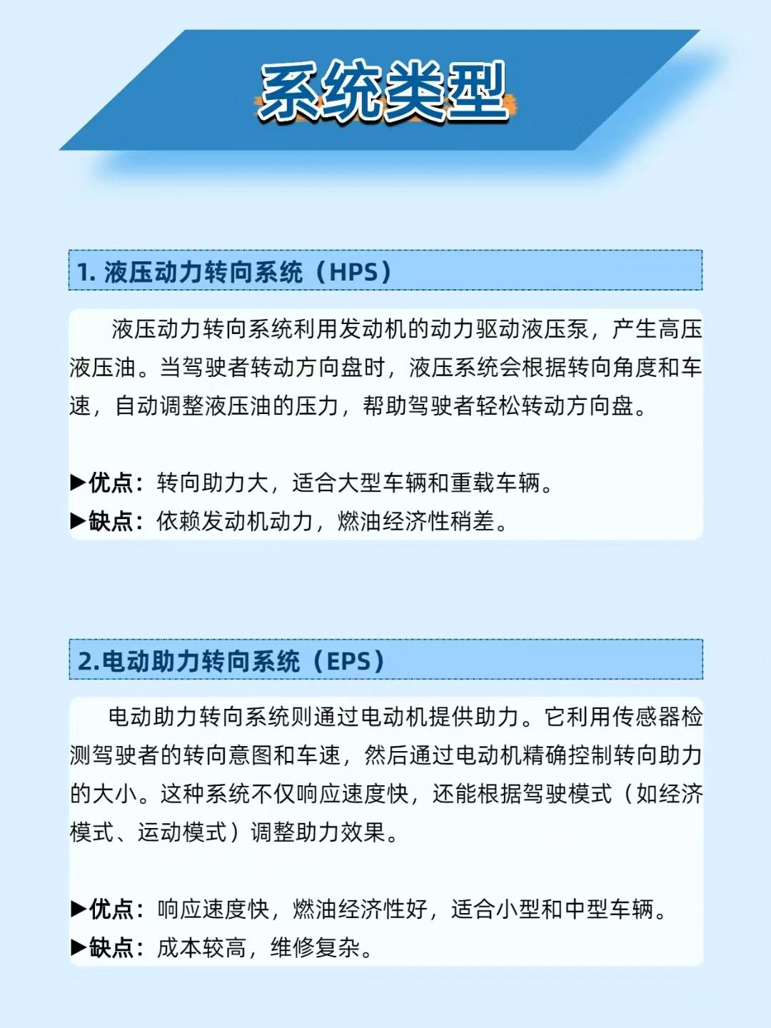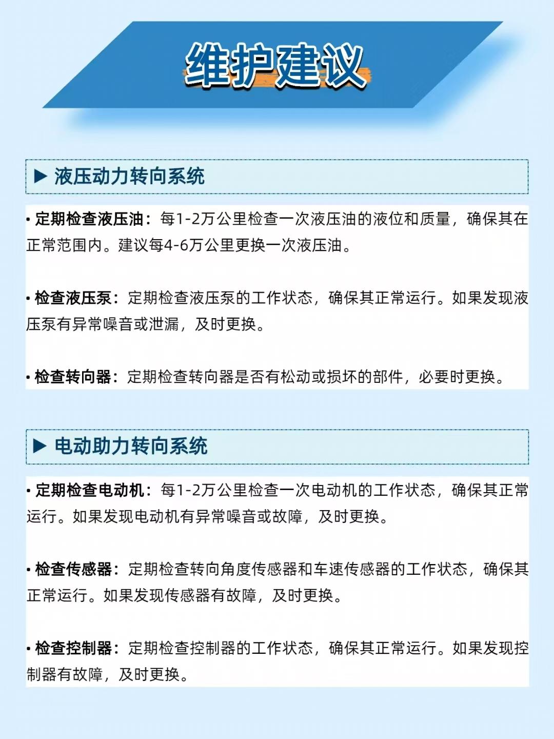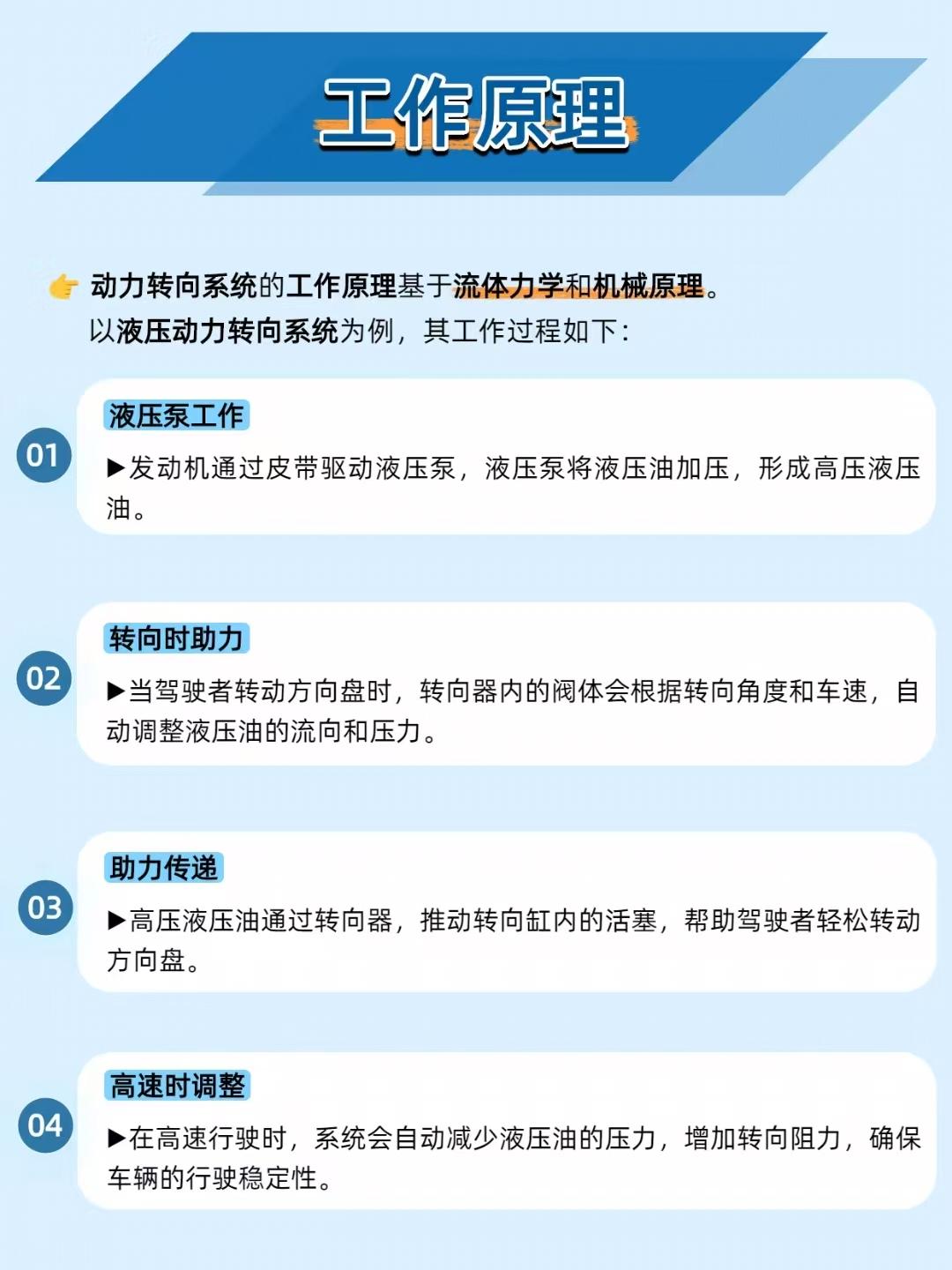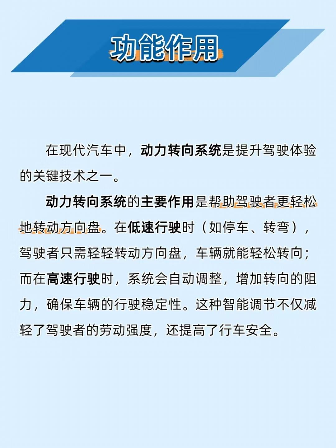 【方向盘轻重全靠它!汽车动力转向系统的 “省力黑科技” 太绝了】 开车时方向盘 “轻重自如” 的秘密,全在动力转向系统里!它低速时助力让转弯超轻松,高速时增加阻力保稳定,堪称驾驶体验的 “调节器”~ ——————————————————————————————————————————— 🔧 两种类型怎么选? 液压动力转向(HPS):助力大,适合大车 / 重载车,但依赖发动机,油耗稍高; 电动助力转向(EPS):响应快、省油,适配小车 / 中型车,就是成本高、维修复杂。 ——————————————————————————————————————————— ⚙️ 工作原理秒懂 液压款:发动机驱动液压泵→高压油随转向角度 / 车速调整→推动活塞助力转向; 电动款:传感器测转向意图 / 车速→ECU 计算助力大小→电机精准输出助力。 ——————————————————————————————————————————— ⚠️ 这些问题别忽视 转向沉重:液压款查液压油,电动款查电机 / 控制器; 方向盘抖动:检查转向部件是否松动,轮胎也要做动平衡; 助力失效:液压款换液压泵,电动款换电机 / 控制器。 ——————————————————————————————————————————— 📌 维护牢记这几点 液压款:每 1-2 万公里查液压油,4-6 万公里换一次; 电动款:每 1-2 万公里查电机、传感器,有故障及时换。 你的车是液压还是电动转向?评论区聊聊驾驶感受~