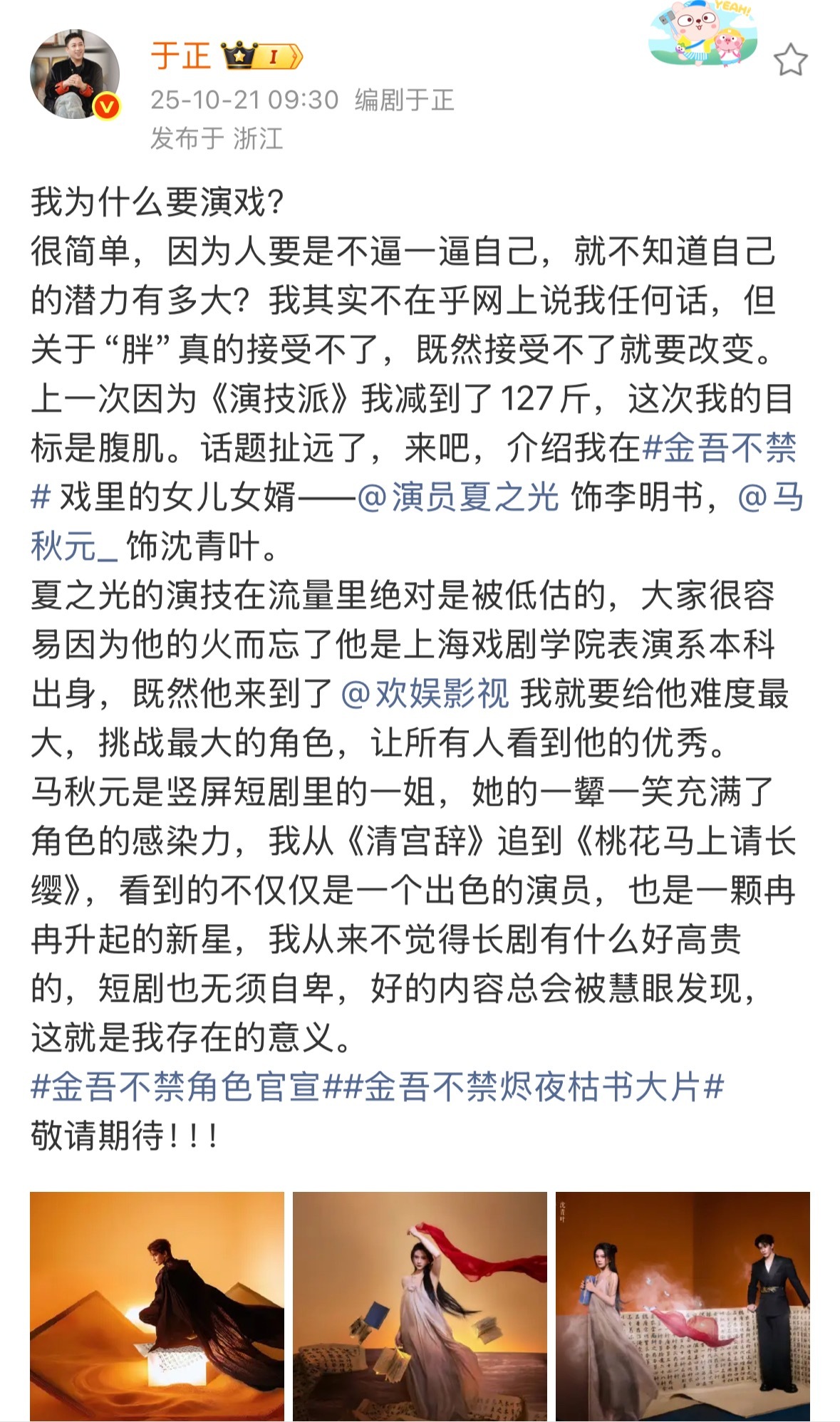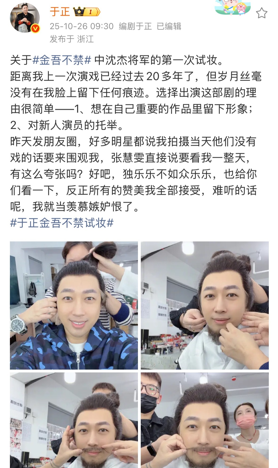 于正《金吾不禁》定妆照来了,于正笑的灿烂,身穿铠甲,看起来对造型非常满意