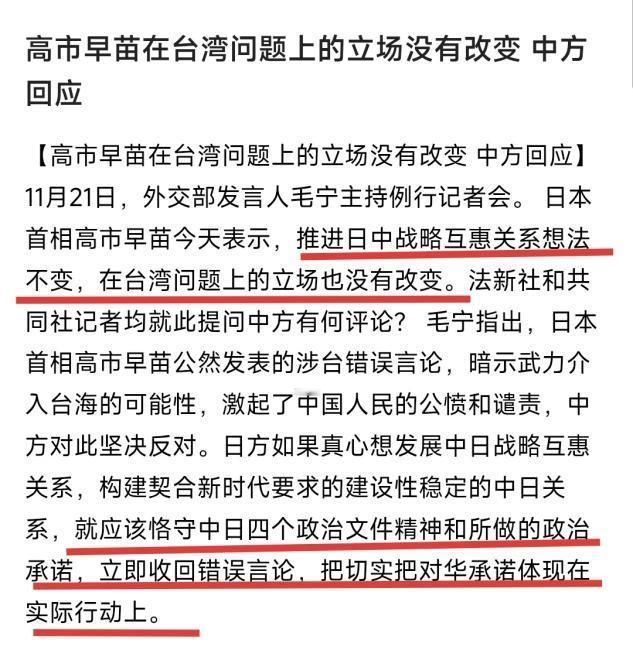 死鸭子嘴硬!高市早苗称“立场不变”,不收回、不道歉,妄想中国大事化小小事化了? 据多家日媒报道,当地时间21日,在引发了巨大争论后,高市早苗首次公开回应了其挑衅言论。在首相官邸回答记者提问时,她声称:仍将坚持此前中日首脑会晤时确立的方向,要全面推进与中方的互利共赢战略关系,构建与中方的建设性稳定关系。日方在台湾问题上的立场没有改变。 对此,中国外交部发言人毛宁在当天晚些时候回应称,中方对高市早苗的言论表示坚决反对,要求其立刻收回错误言论。外交部驳斥高市早苗风波后首次回应 怎么理解高市早苗的这番最新表态呢?重点应该有3个。 第一,她仍然死鸭子嘴硬,故意回避了中方提出的要求,对中方要求只字不提,显然依旧死性不改,拒绝收回挑衅言论并道歉,也不认为自己有错。 第二,她特意以含糊其辞的“没有改变”等表述来解释日方立场,甚至不肯公开说一句“日方坚持一个中国原则”、“恪守中日四个政治文件”,这就是想用语焉不详来蒙混过关,希望中国可以大事化小、小事化了。 第三,她还强调了仍想保持中日友好的意思,显然是又在装受害者,想将拒绝沟通、激化中日矛盾的责任甩锅到中方头上。 总结来看,高市早苗目前的态度就是:不愿承认台湾是中国的一部分,不愿尊重中方的底线,不愿满足中方的要求,。但还想中日保持友好关系,维持“政冷经热”状态。最坏的可能是,她就是想以此让日本换到时间和空间积攒力量,以便未来再次发动对外侵略。所以这一次,我们绝不能轻饶了她,绝不能让日本人的狼子野心再次得逞!