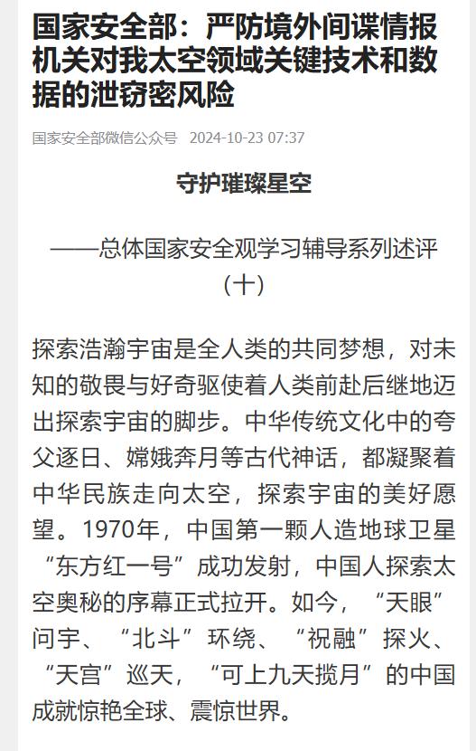国家安全部发文称,严防间谍对我太空关键技术窃密,什么是航天领域的间谍活动?如何防范? 航天领域的间谍活动主要针对火箭、卫星等关键技术信息和数据。 他们可能通过渗透内部人员、网络入侵、技术合作等方式获取敏感信息。 由于航天技术涉及国家安全和核心竞争力,各国都极其重视防范。 防范措施需要从人员管理、信息安全等多方面入手。 所以说在我们的日常生活中,忽然有人问起这些敏感的问题我们都要提高警惕。