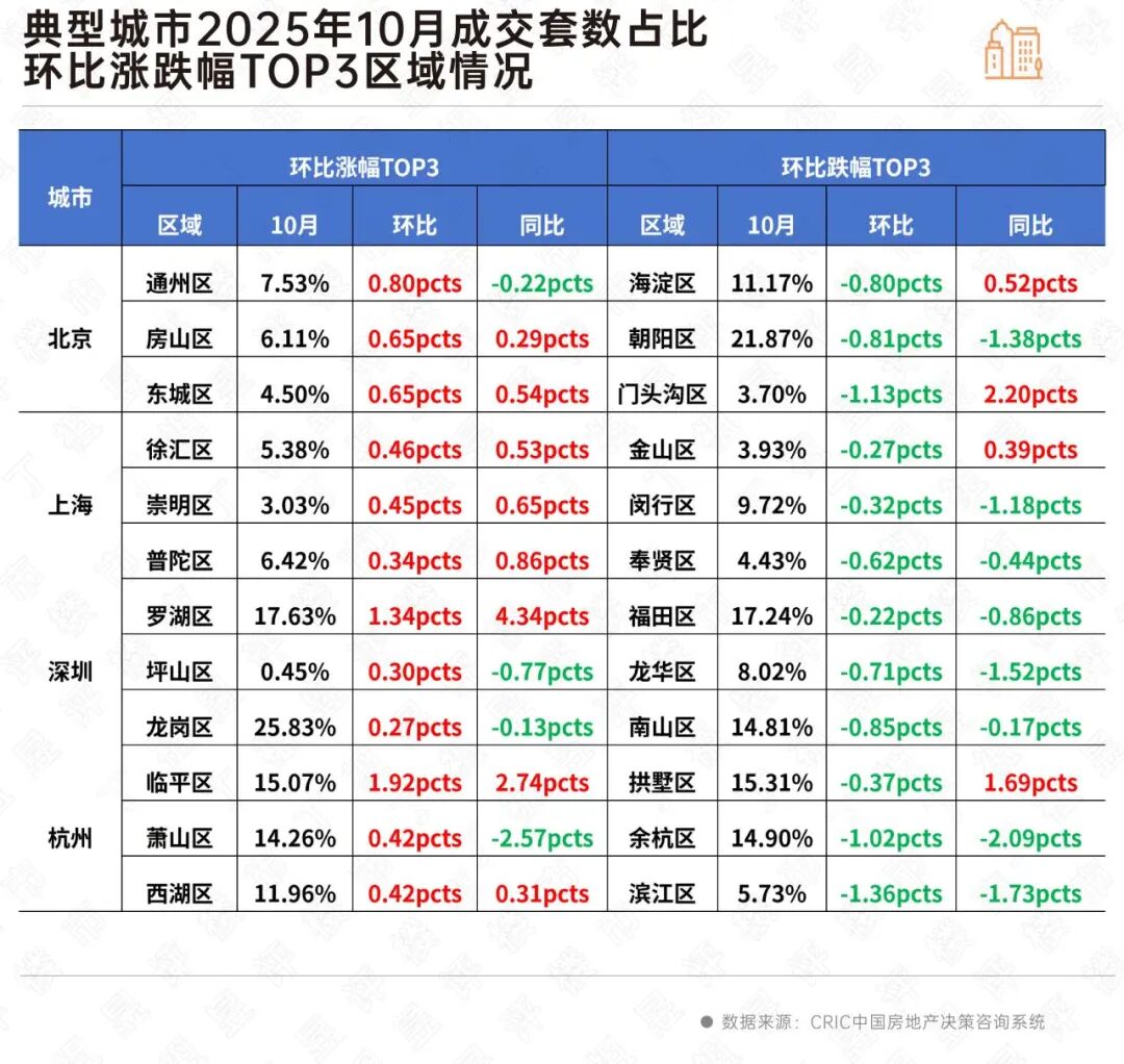 值得注意的是,深圳主力区域成交集中度上升,据CRIC监测数据,深圳罗湖区和龙岗区除了是2025年10月环比涨幅TOP3区域之外,还是成交套数占比TOP3区域。
