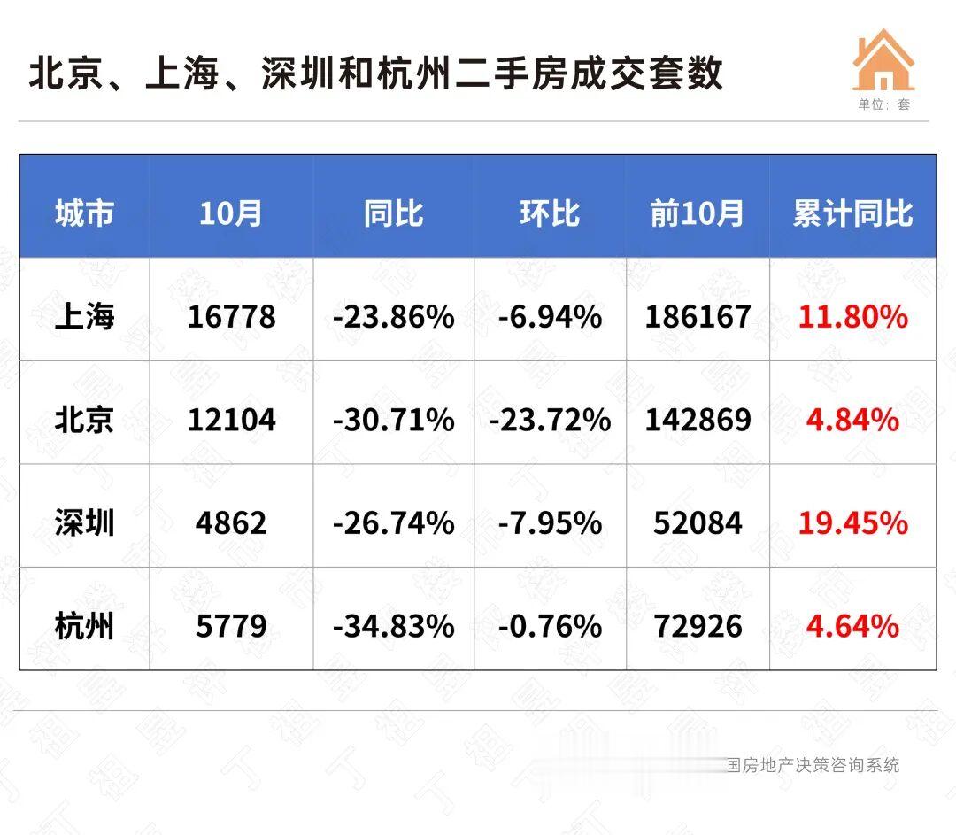 从北京、上海、深圳和杭州四城二手房成交情况来看,前10月累计成交套数同比均保持正增长,10月单月成交同环比均有所下降,增长动能略有放缓。