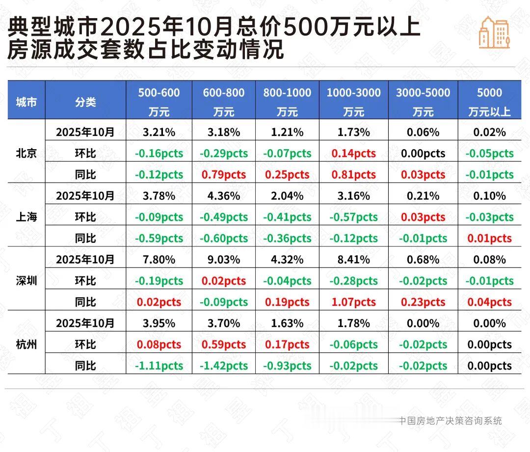据CRIC监测数据,上海和深圳2025年10月总价800万元以上房源成交套数占比环比均呈现出持平或回落。