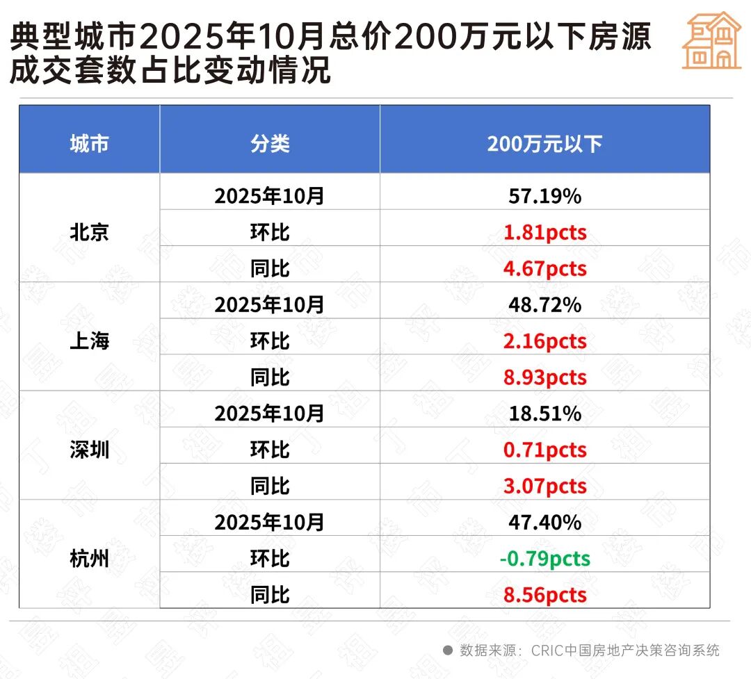 以上海为例,2025年10月总价200万元以内房源成交套数占比为48.72%,环比上升2.16个百分点,同比上升8.93个百分点;市场份额有进一步扩大趋势。