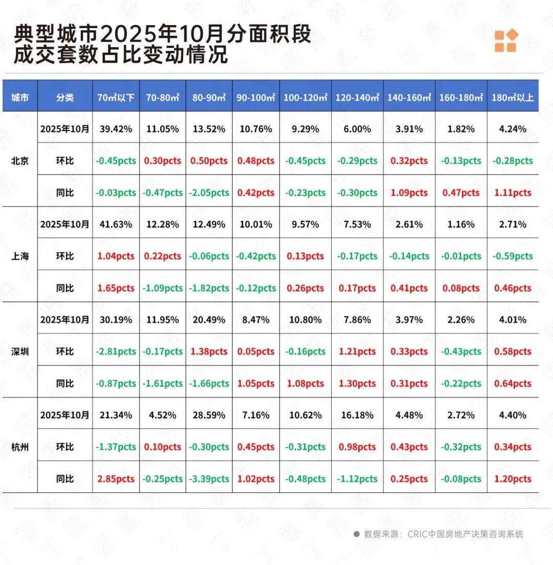 从二手房成交面积段来看,京沪深总体呈现出70平方米以内小面积段仍是成交主力,2025年10月成交套数占比均在3成以上。