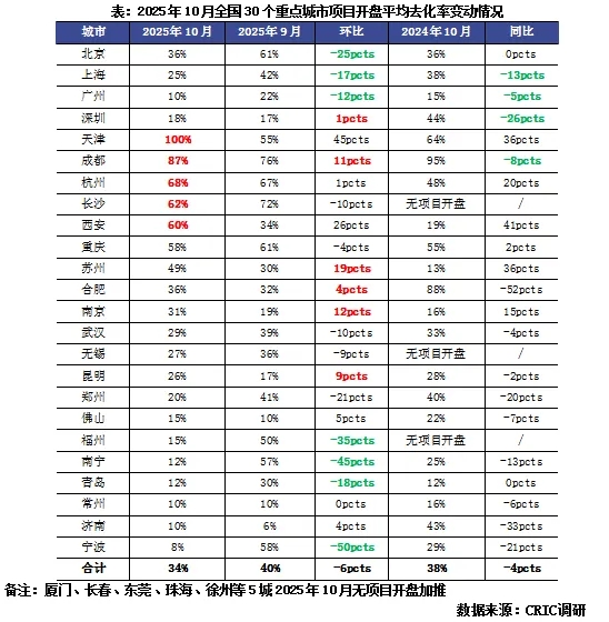 10月市场热度持续回落,据CRIC监测数据,30个重点城市10月平均开盘去化率为34%,环比降6pcts,同比亦下降4pcts。厦门、长春、东莞、珠海、徐州等5城本月无项目加推。