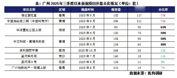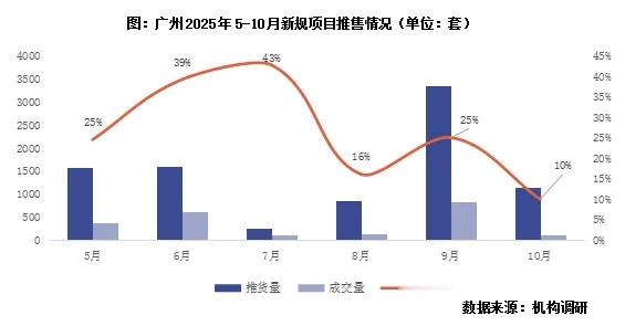 不过值得关注的是,随着各地新规/四代宅产品集中入市,销量亦有分化迹象,并非所有项目均能热销,以广州为例,2025年第二季度新规项目集中入市以来,整体去化率呈现出波动下行走势,近3月新规项目综合去化率明显回落,据CRIC监测数据,10月全市共11个新规项目入市,推货量占全市超七成,认购量占全市八成;但是去化率由2025年9月的25%降至10%,为近半年来最低位。