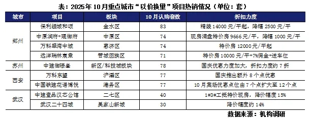 武汉10月老规项目以价换量效果显著:中建壹品汉芯公馆(二七)利用十一假期积极营销,以特价房、清栋促销名义让利促销,实现较高转化;武汉二十四城(吴家山新城)以工抵房名义促销让利,单周认购水平小有提升。