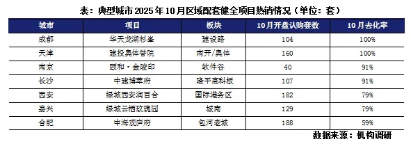 分城市来看,去化率超6成城市为天津、成都、杭州、长沙、西安,除杭州、成都为短期热度较高城市之外,天津、长沙、西安等主要得益于个别网红盘集中入市对去化率拉升作用比较显著。