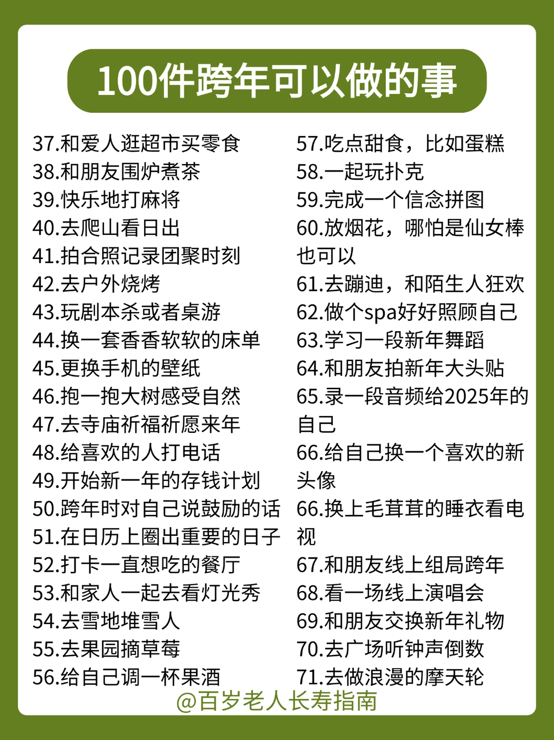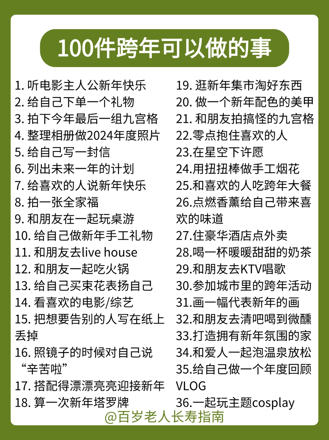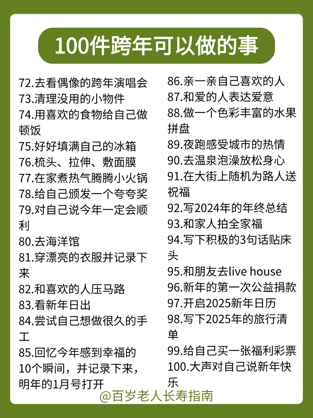 还有不到一周就2025啦,列好你的元旦跨年计划了,如果没有的话,不妨来做这100件小事,一起来快乐迎接2025吧~