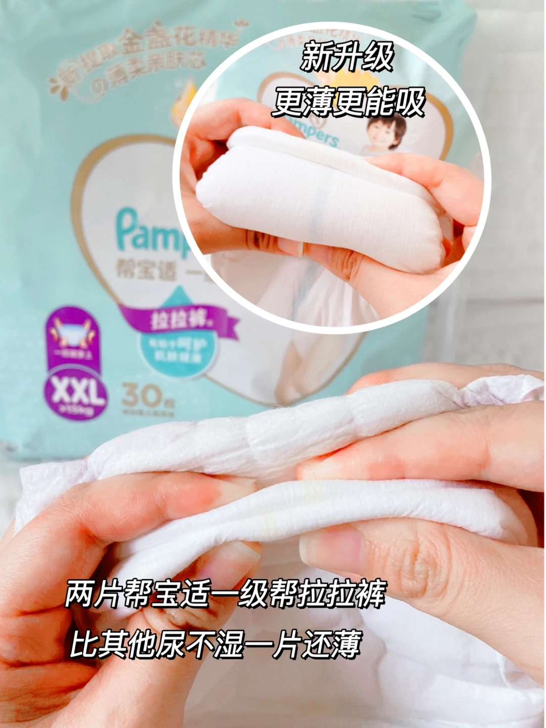 真的好薄!吸量大,而且透气性好,宝宝白天喜欢跑跑跳跳,活动量大很容易出汗,夏天穿这款就不担心屁屁闷汗了~