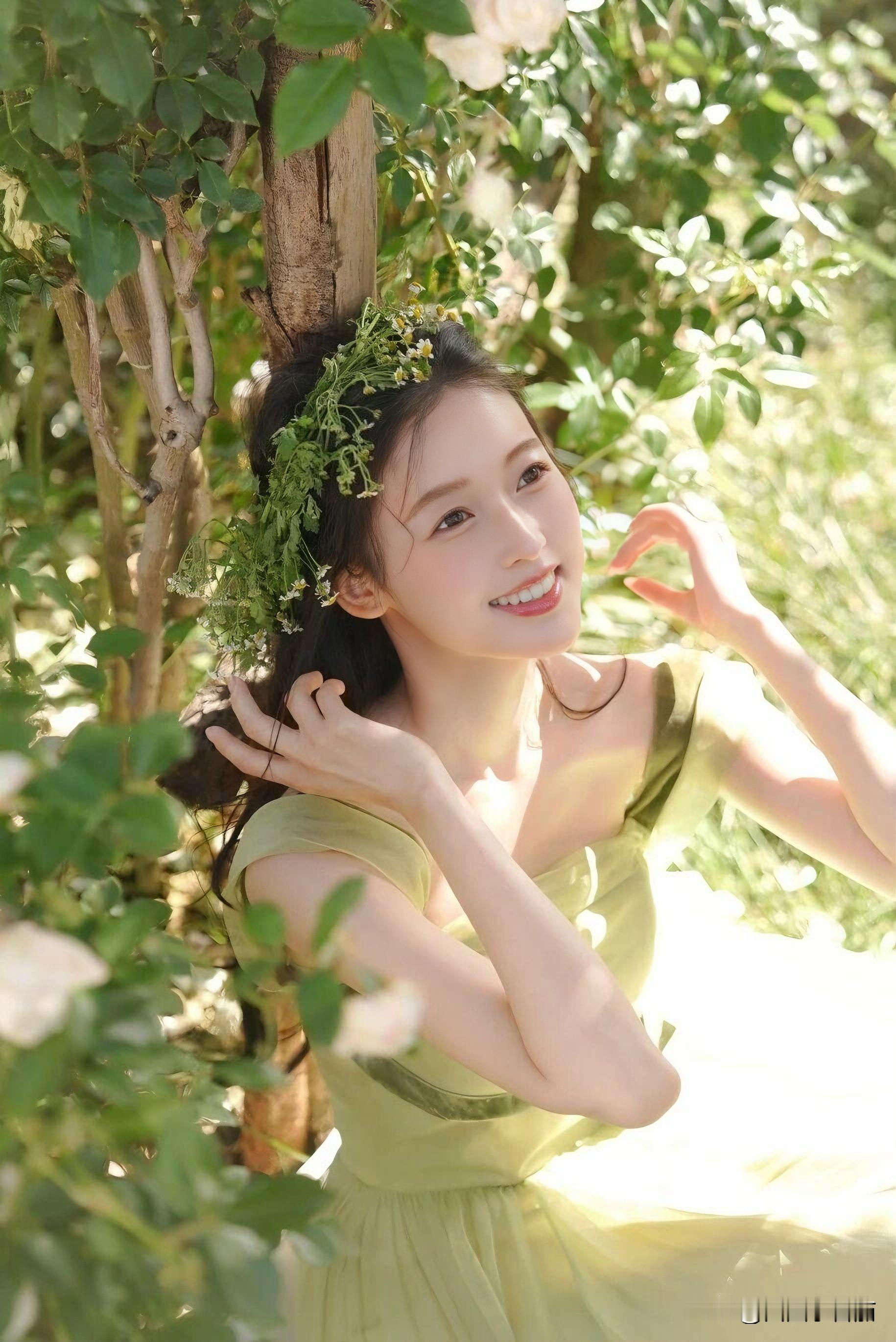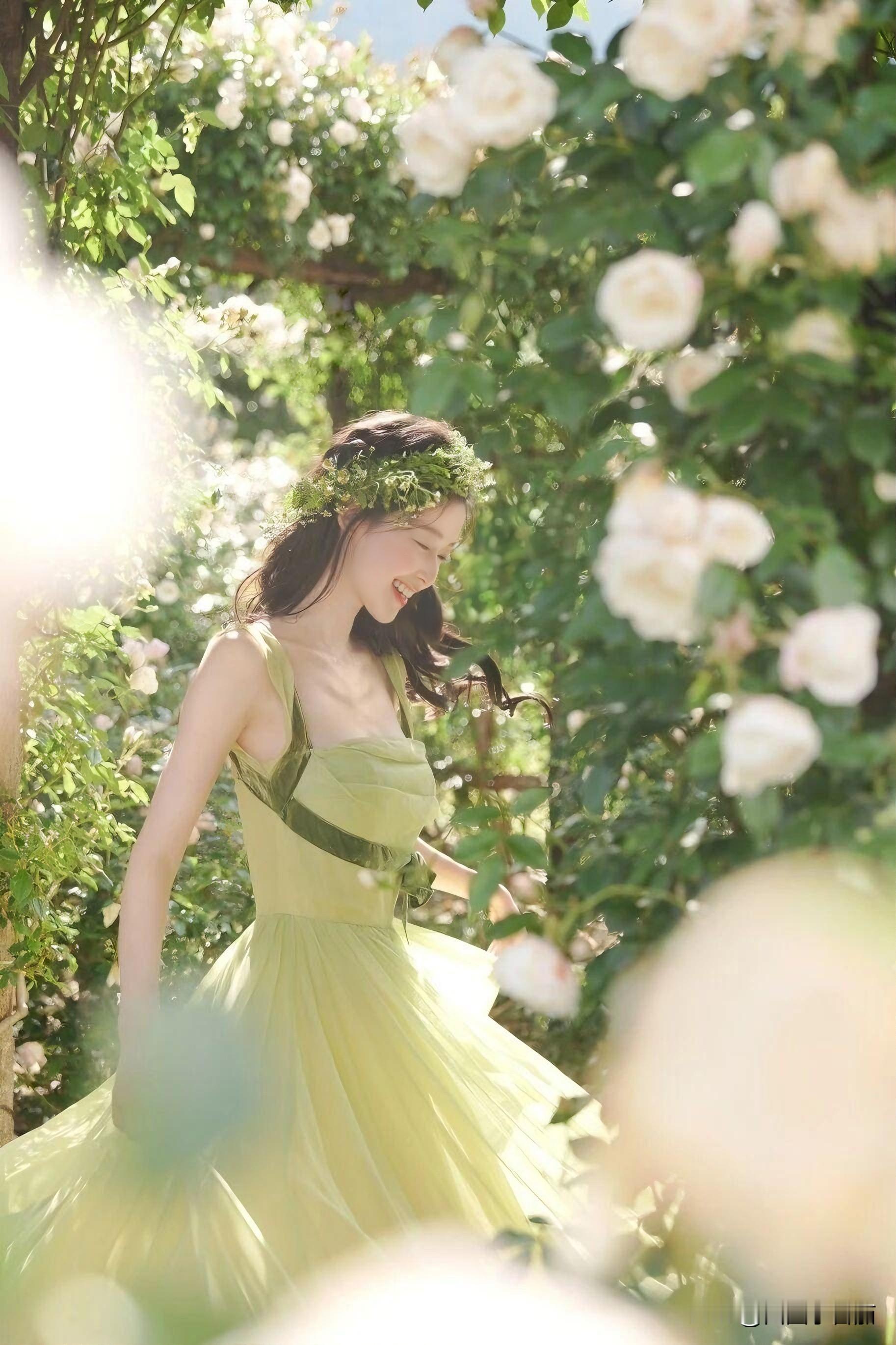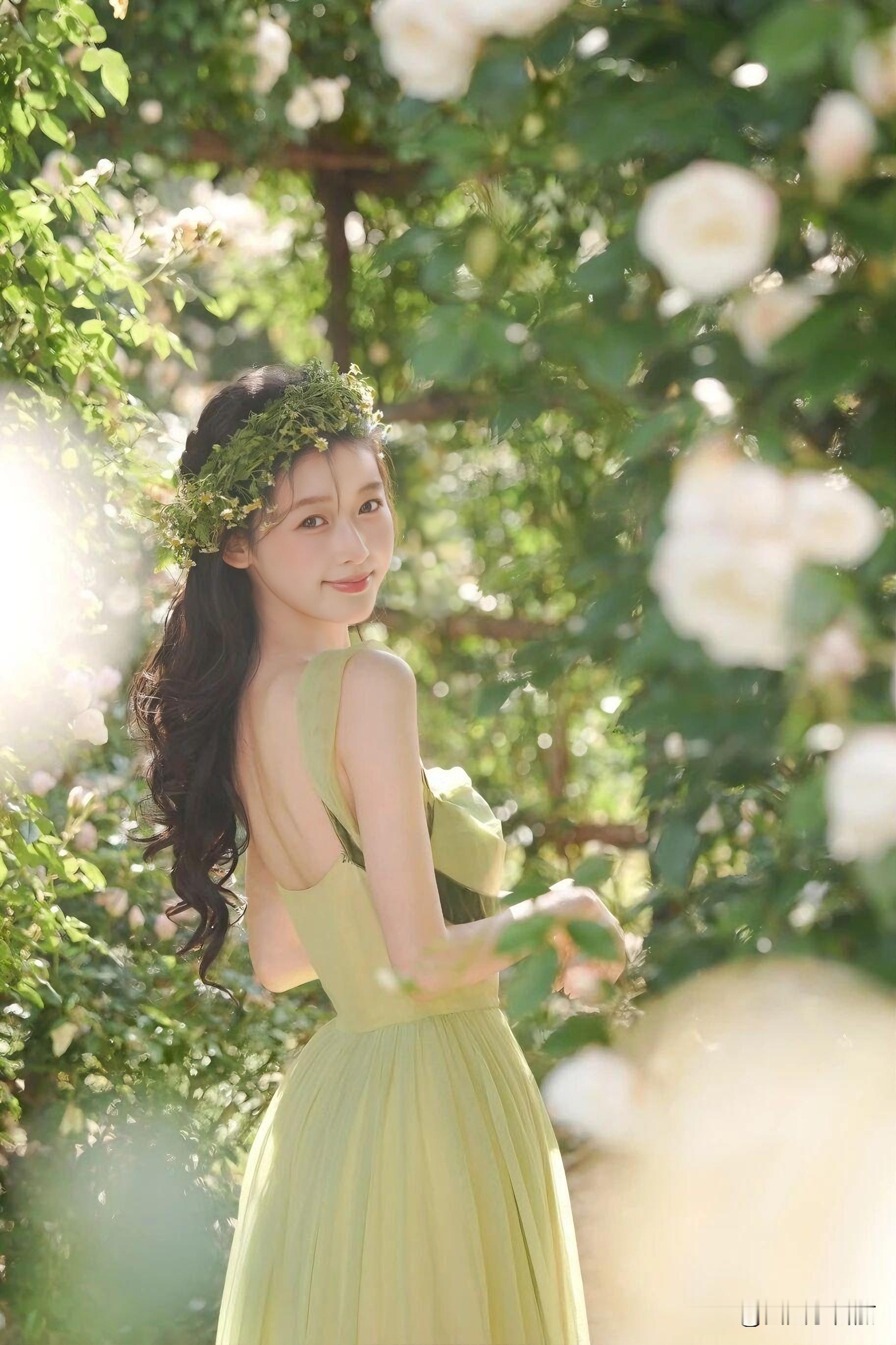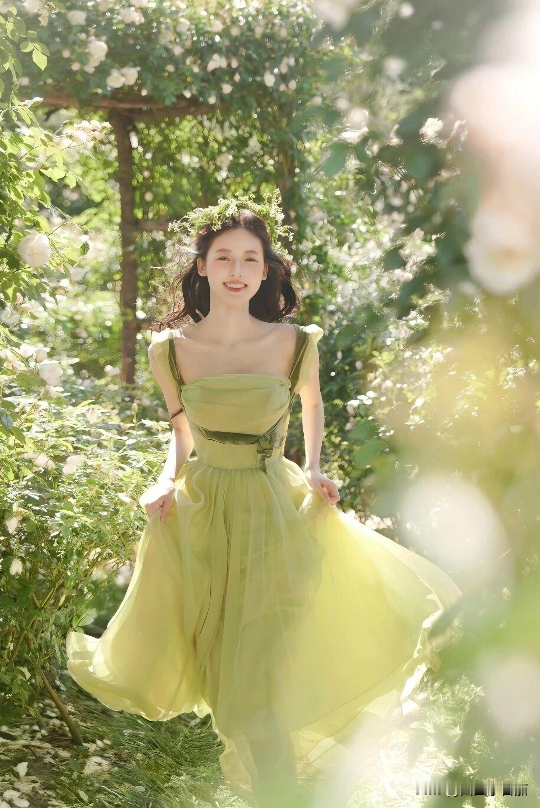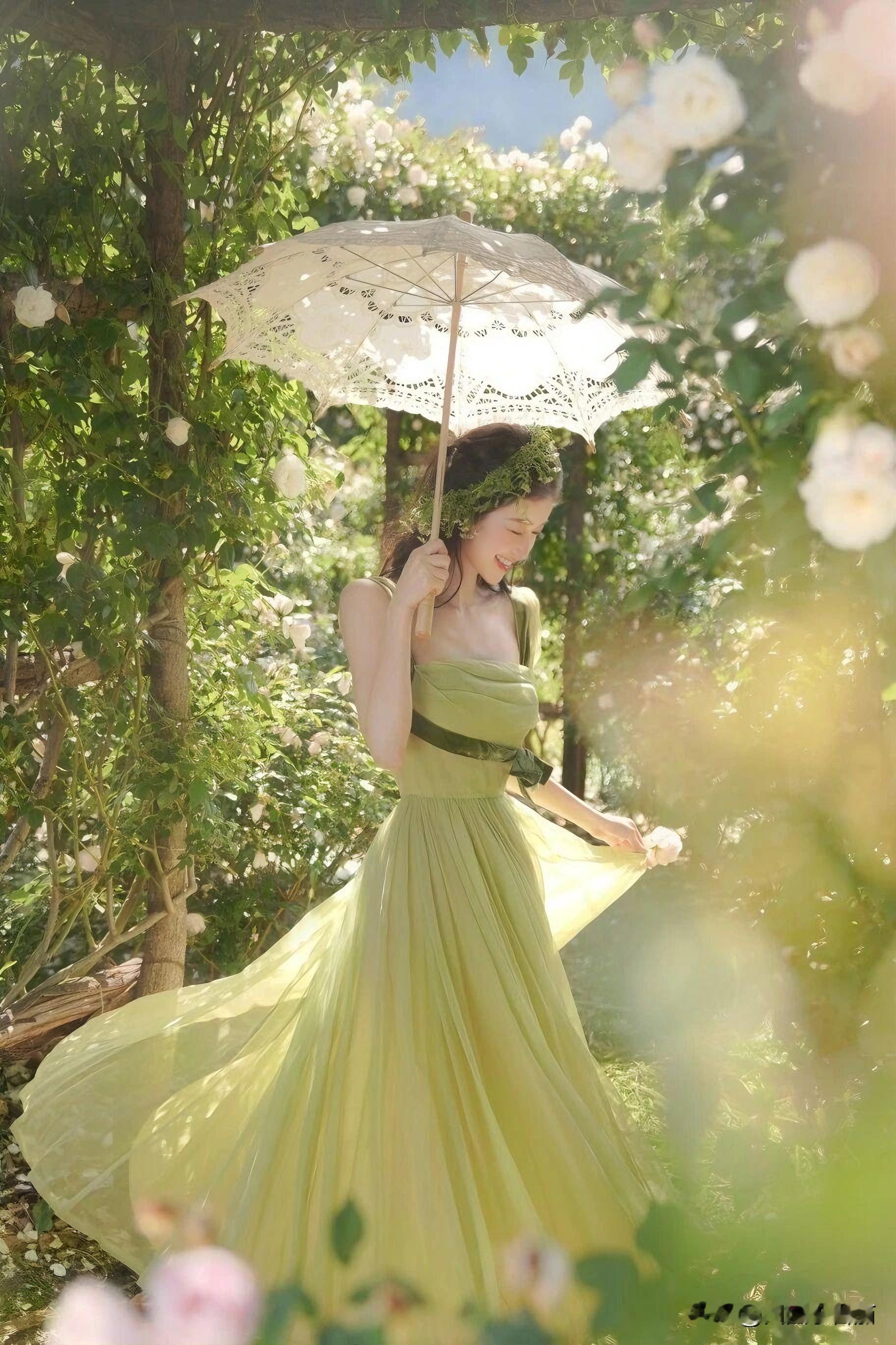薄荷绿缎面裙裹着少女的笑,肩头缎带在风里打了个温柔的结。发间编着碎花环的她,指尖捻着未放的苞,像误闯花境的精灵。蕾丝伞筛下光斑,每一步都踩碎阳光——不是拍写真,是春日自己开了个镜。