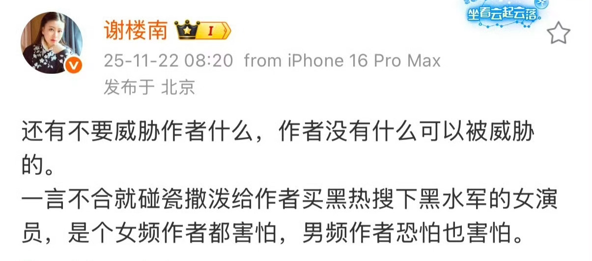妈呀,《凤凰台上》作者谢楼南今早还秒删了一条这个微博🙉🙉“一言不合就碰瓷撒泼给作者买黑热搜下黑水军的女演员,是个女频作者都害怕,男频作者恐怕也害怕。”