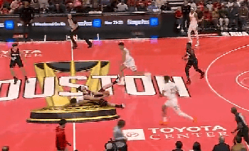 第二节比赛,申京倒地抢球脑后一抛,助攻谢泼德反击双手暴扣。