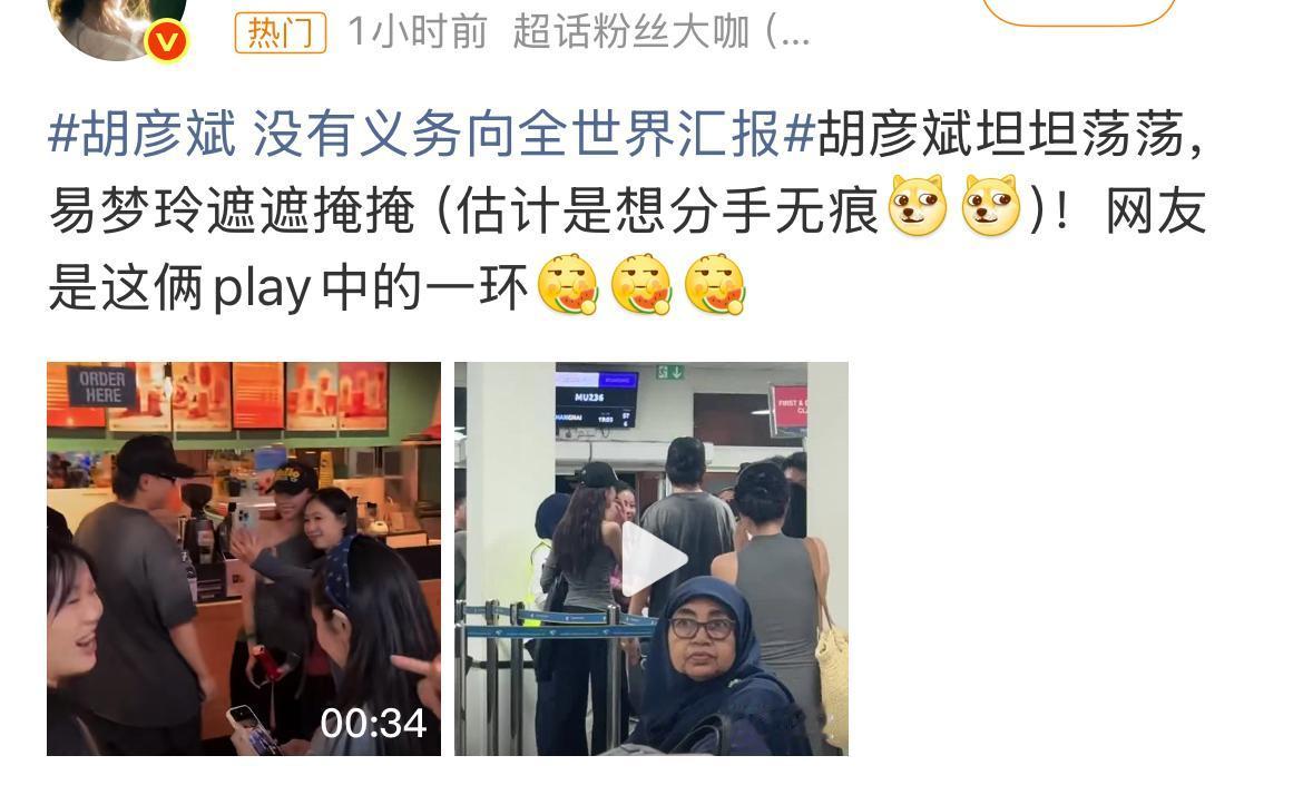 粉丝脱粉了! 胡彦斌和易梦玲恋情曝光后,各方反应太搞笑了哈哈。 胡彦斌也是神人,虽然他不是流量艺人,但每一次的恋情都能引起内娱“大地震”。因为他每一次找的女友都是话题女星。 昨天全网热搜都是胡彦斌和易梦玲的海边亲吻照。对于这件事,各方的反应不同,女方:直接否认,并表示这件事很搞笑,还说照片是AI的。男方:大方承认,还在机场向大众澄清照片不是AI。男方粉丝:大规模脱粉,演唱会都不想宣传了。 偶像恋情曝光,粉丝都是不开心的,胡彦斌也不例外。更为离谱的是,明知道粉丝不开心,胡彦斌还在粉丝伤口上撒盐,说,“没有想要瞒着,也没有义务向全世界汇报”。 这个话一出,粉丝更加伤心了,引发大规模脱粉。