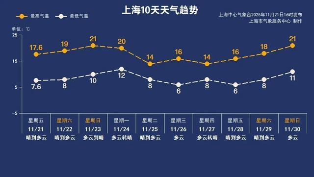 明后两天,最高气温重回20℃+,是近期高点,“小阳春”体感限时返场。不过未来一周有两场冷空气已蓄势待发,分别在周二和周四前后,届时最高气温会下滑至14℃左右,最低气温6~7℃。大家要及时添衣。未来几天以晴或多云为主,阳光持续在线,天干物燥,要记得多多补水哦!