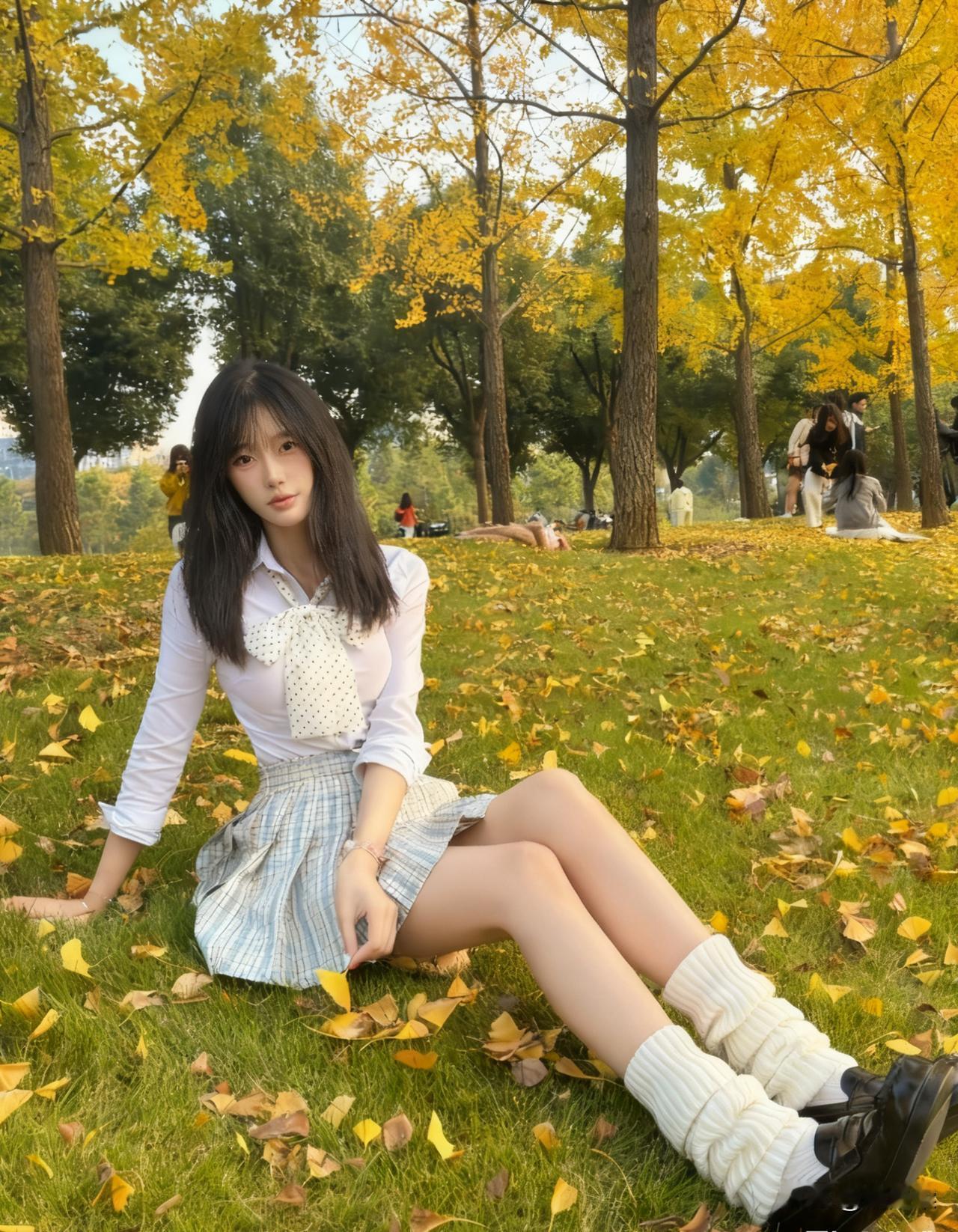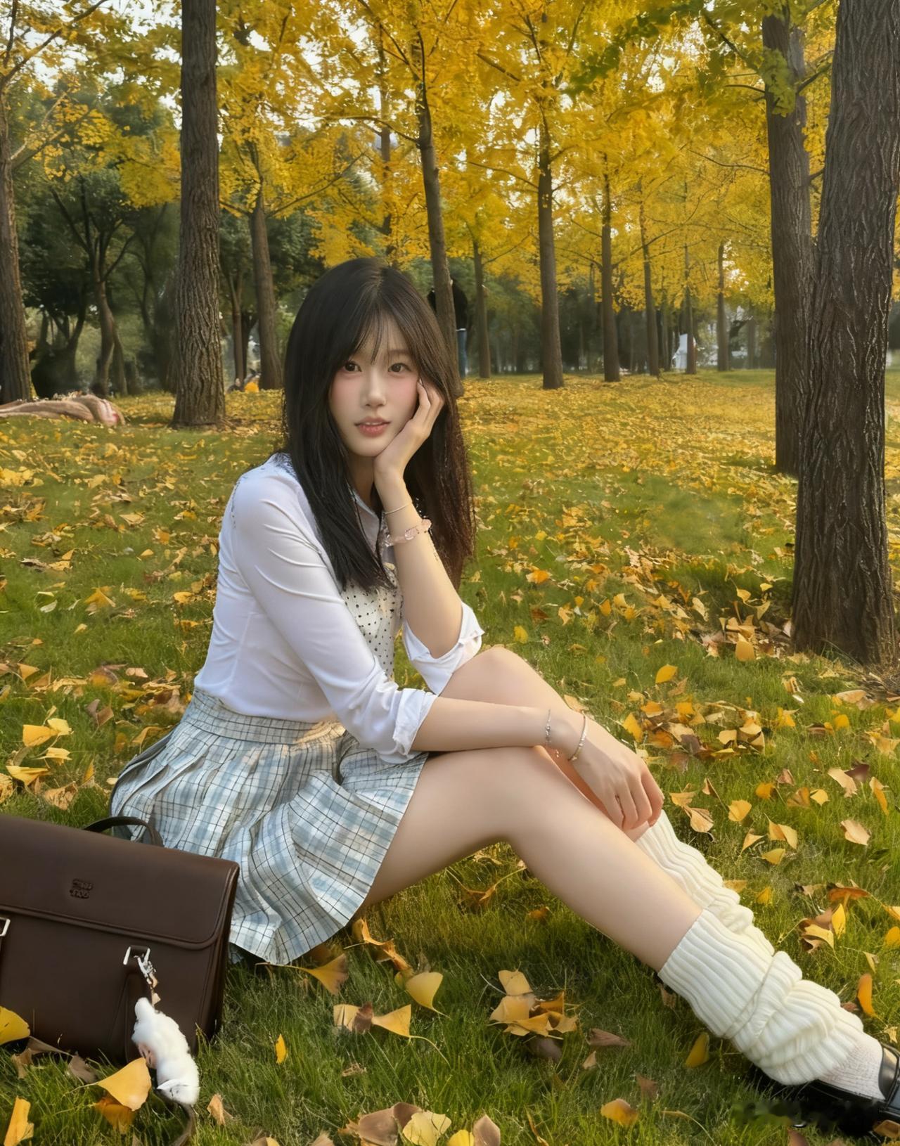 秋日里的黄色银杏树下,超甜美超可爱的花季美少女~