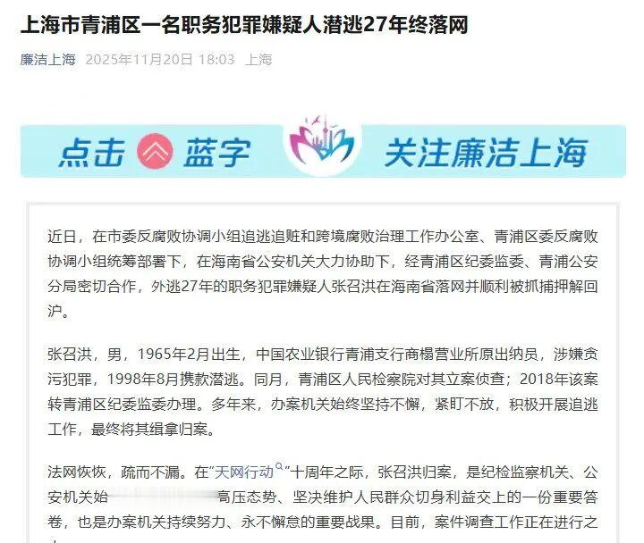 2025年11月20日,据廉洁上海消息,近日,在市委反腐败协调小组追逃追赃和跨境腐败治理工作办公室、青浦区委反腐败协调小组统筹部署下,在海南省公安机关大力协助下,经青浦区纪委监委、青浦公安分局密切合作,外逃27年的职务犯罪嫌疑人张召洪在海南省落网并顺利被抓捕押解回沪。