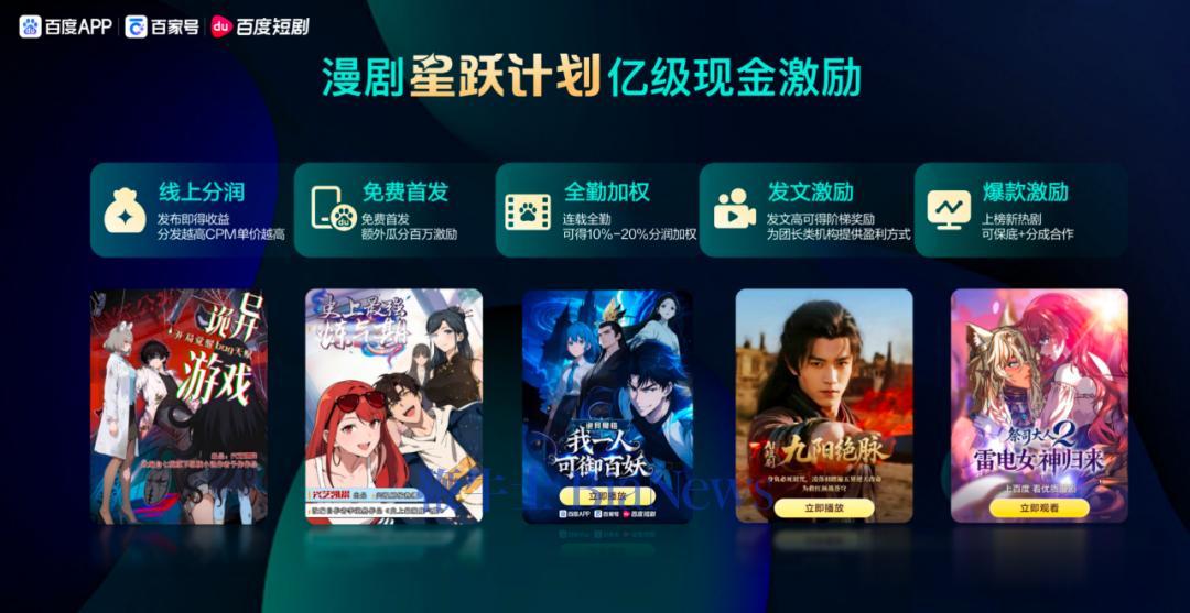 她提到百度的漫剧星跃计划亿级现金激励,包括线上分润、免费首发、全勤加权、发文激励和爆款激励。