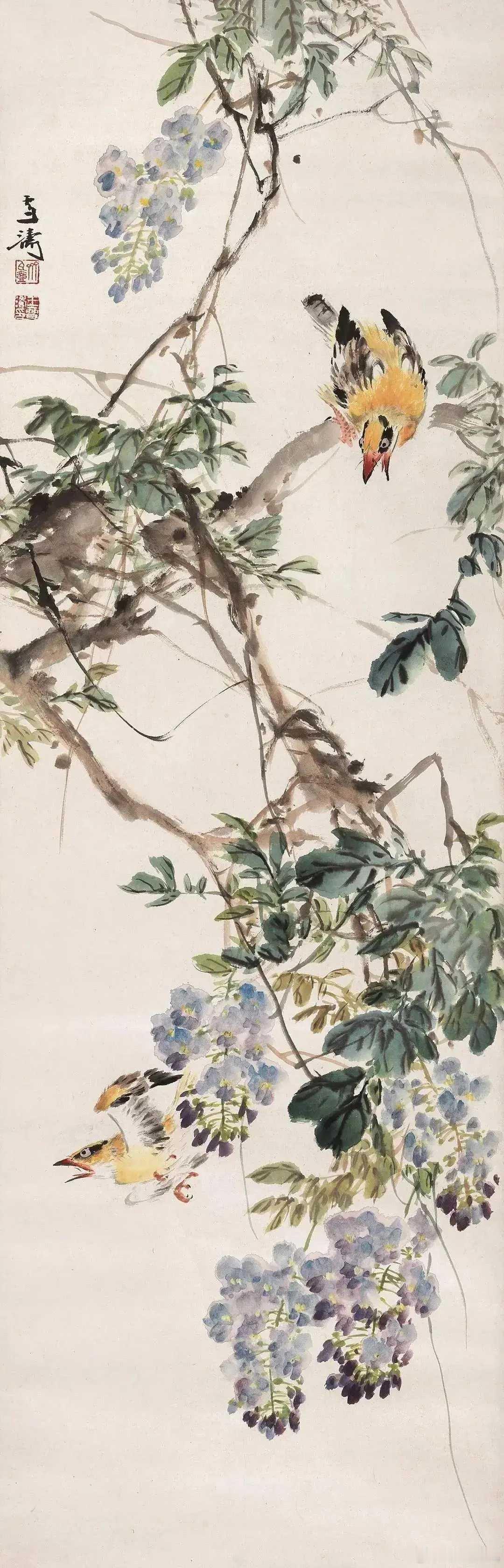 王雪涛花鸟画。王雪涛作品题材广泛,构思精巧,形似神俏,清新秀丽,富有笔墨情趣。创作上主张“师法造化而抒己之情,物我一体,学先人为我所用,不断创新”。画法上工写结合,虚实结合。他善于描绘花鸟世界的丰富多彩和活泼生气,又精于表现画家的心灵感受和动人想象。