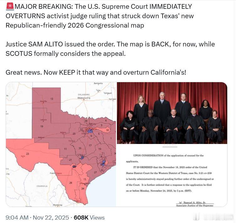 美国最高法院推翻了一名“激进法官”裁定德州2026年有利共和党的新国会选区地图无效的判决。由大法官萨姆·阿利托签署命令。该选区地图目前恢复生效,在最高法院正式审理上诉期间继续执行。