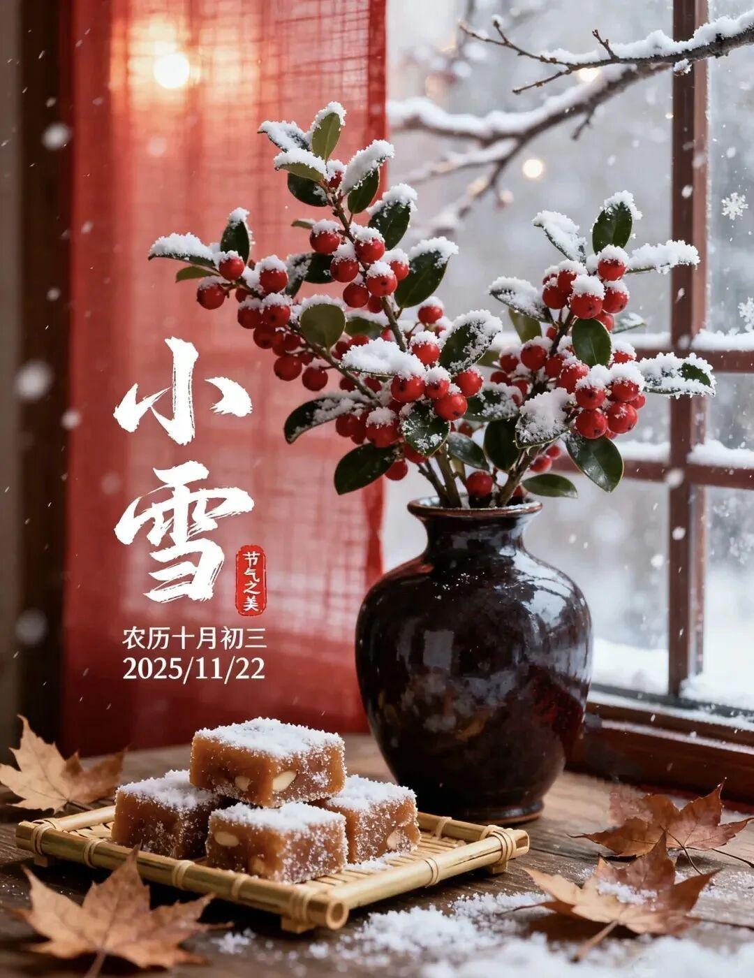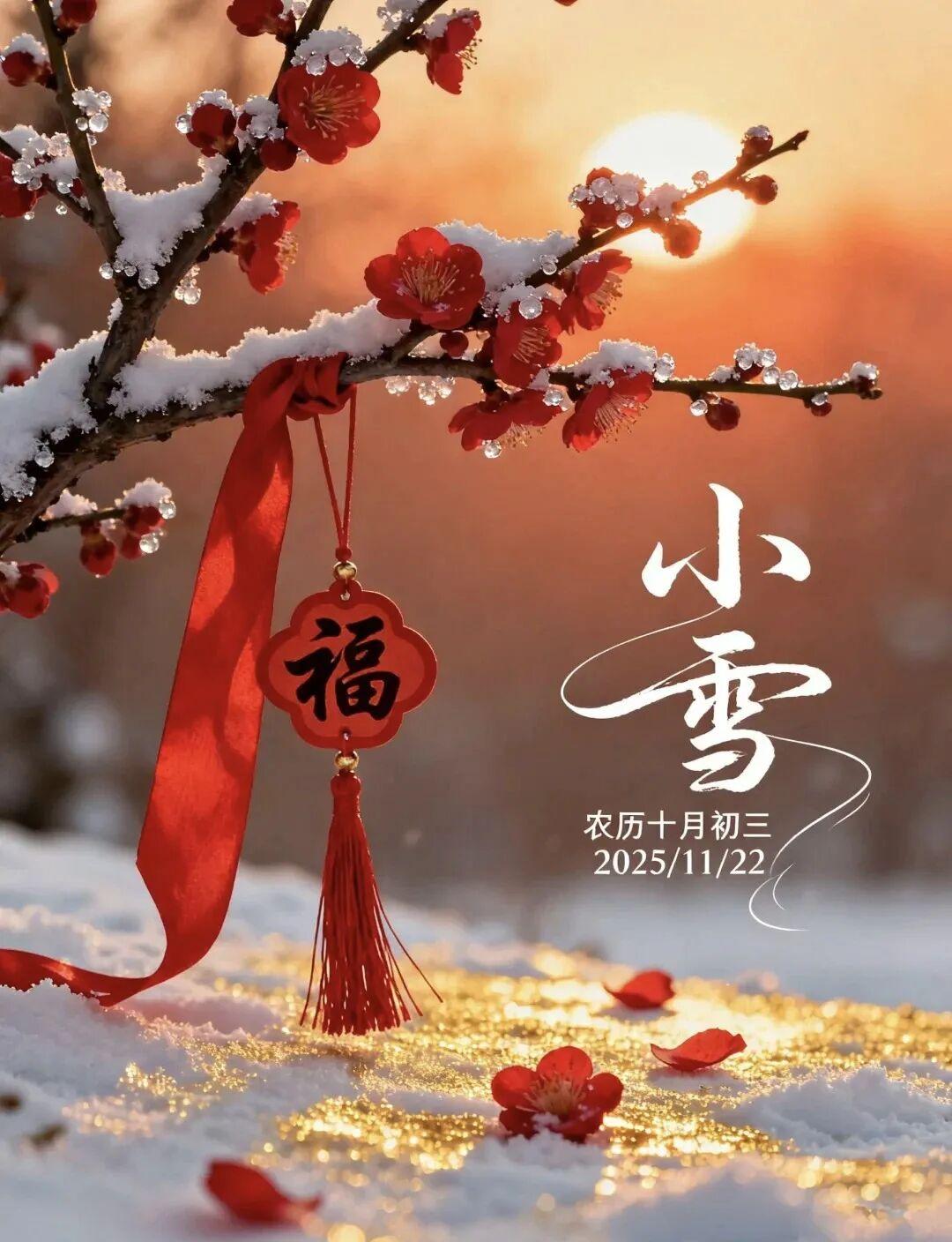 小雪 翠柏青松,绿意朦胧,小雪时节思绪千万种。饮尽杯酒,暖意奔流,蓦然回首友情仍深厚。天寒地冻,呼啸烈风,友友谨记健康记心中。 摇曳翠柳绿意浓 岭上枫姿叶正红 院前银杏金闪闪 屋后菊绽鸟鸣鸣 小雪已至吹寒风 梧桐叶落掩日空 杏黄枫丹百花残 白发如霜草枯丛