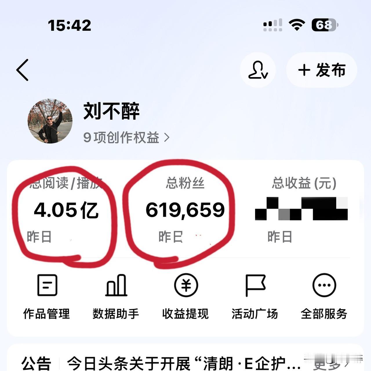 今天点赞量突破1038万人次! 累计阅读量超4.05亿; 粉丝数达61.9659个; 距62万目标,还差341个名额! 力争在23日、24日达成62万目标。 诚邀您加入@刘不醉 粉丝团队, 携手助力解锁平台权益, 提升内容变现能力。