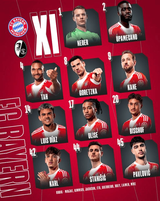 虎扑11月22日讯今天22:30,拜仁慕尼黑主场迎战弗赖堡,赛前双方公布了首发名单: