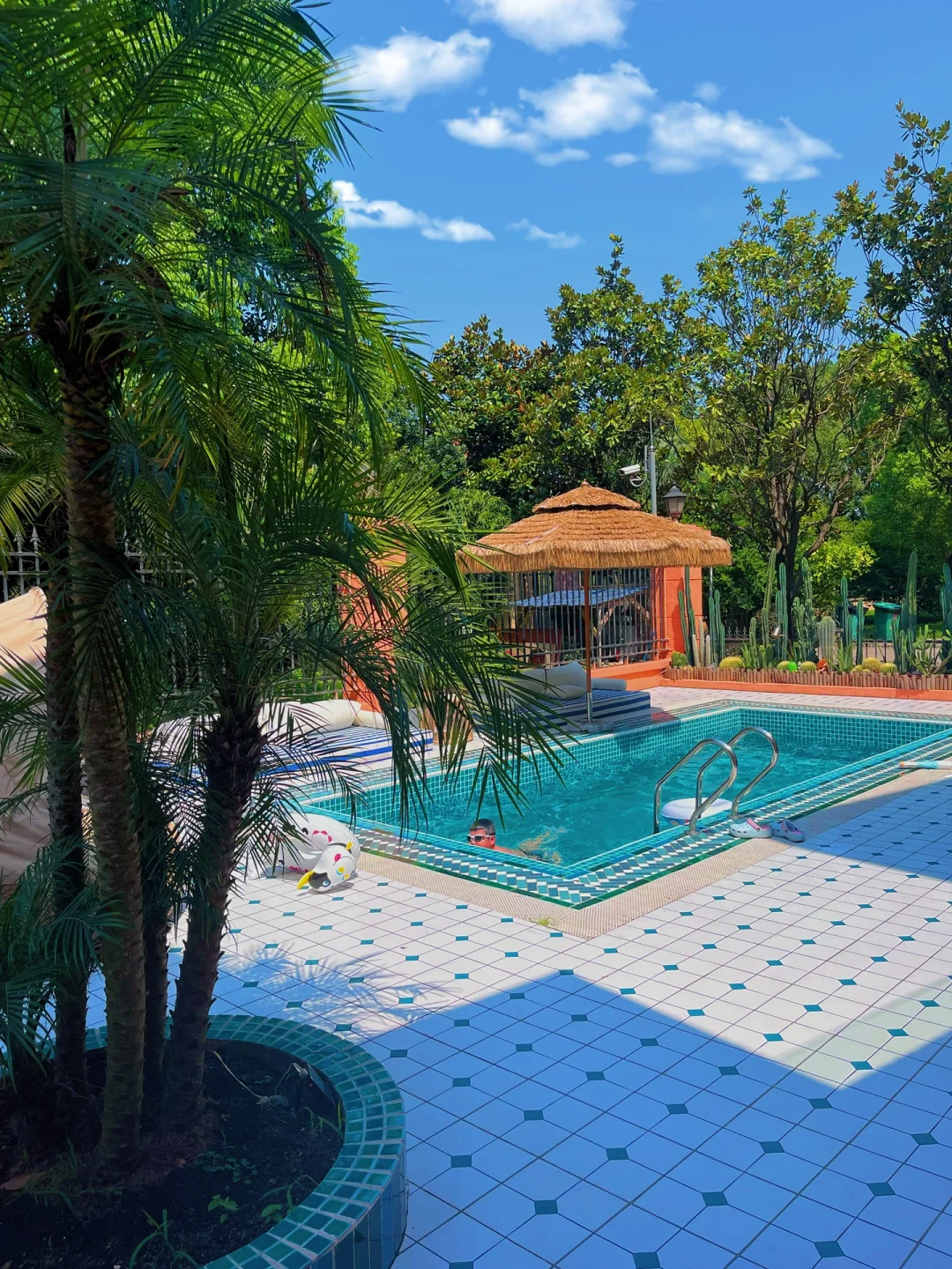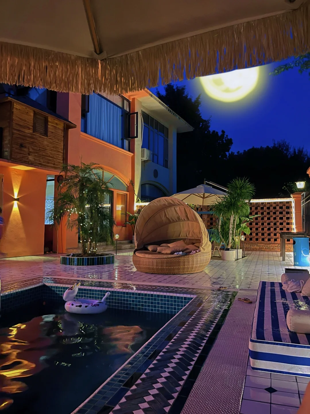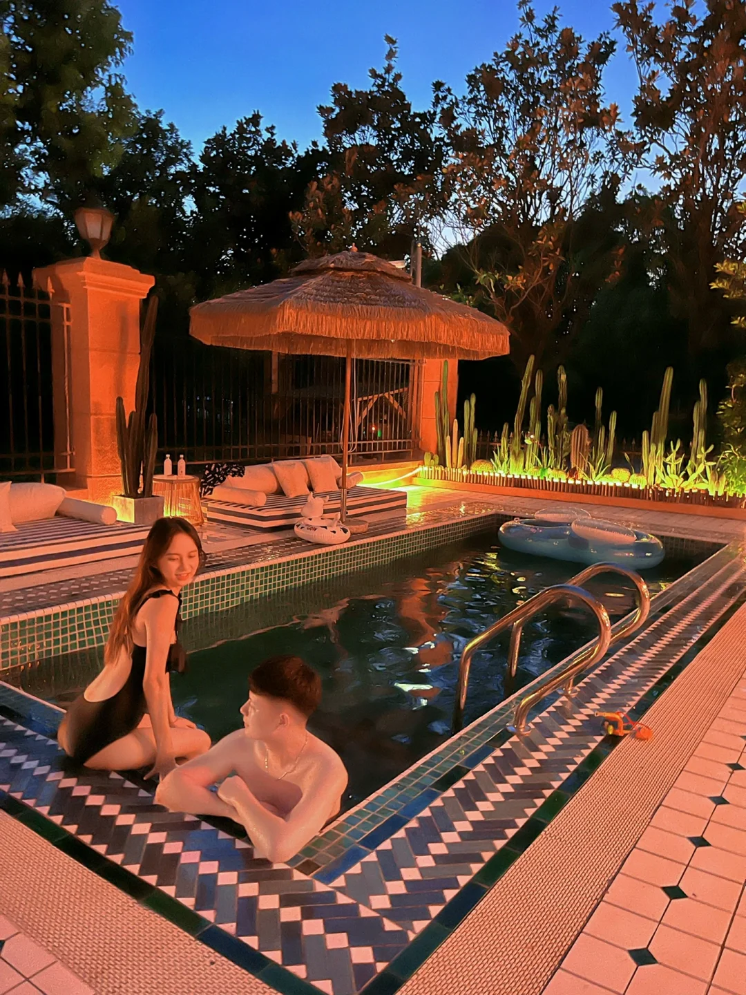 晚上夜幕降临,泳池旁的灯亮起来💡💡💡