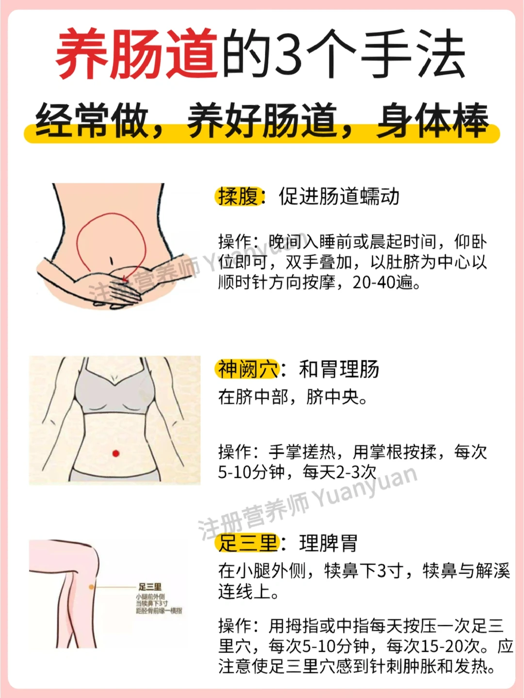 🔺 养肠道手法:揉腹、神阙穴、足三里,具体详见图3。