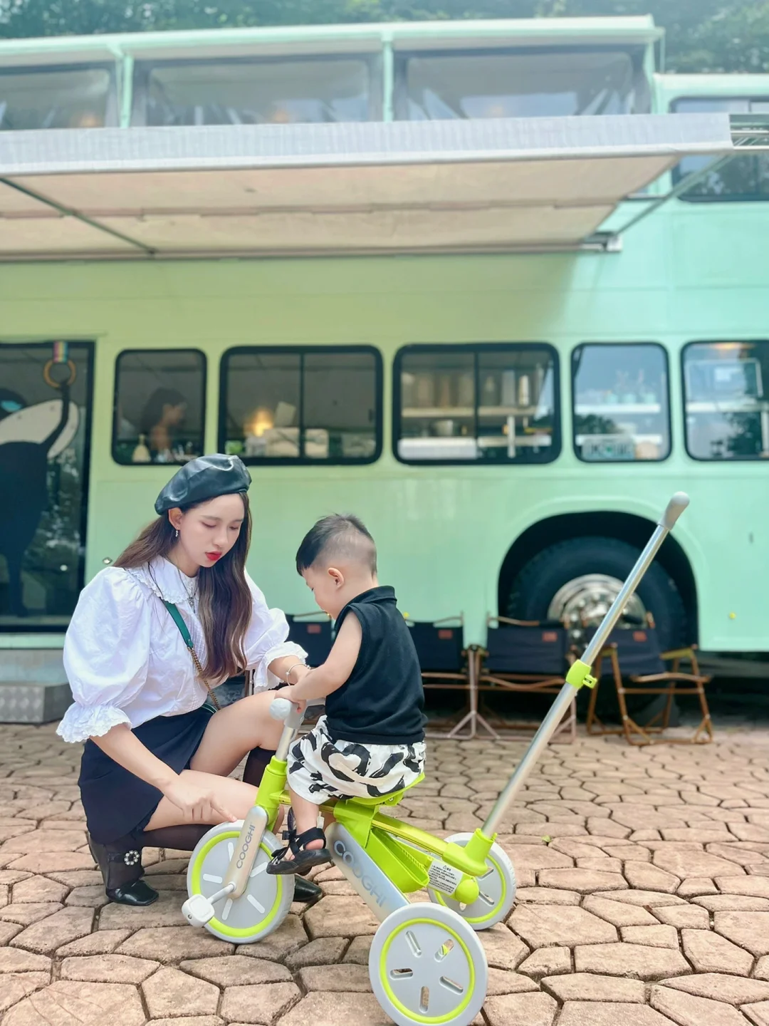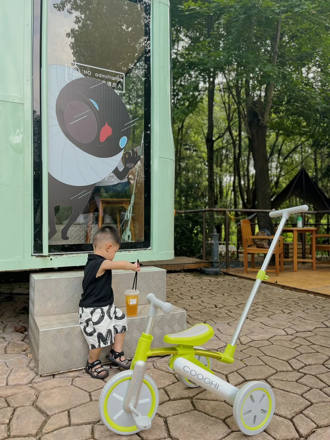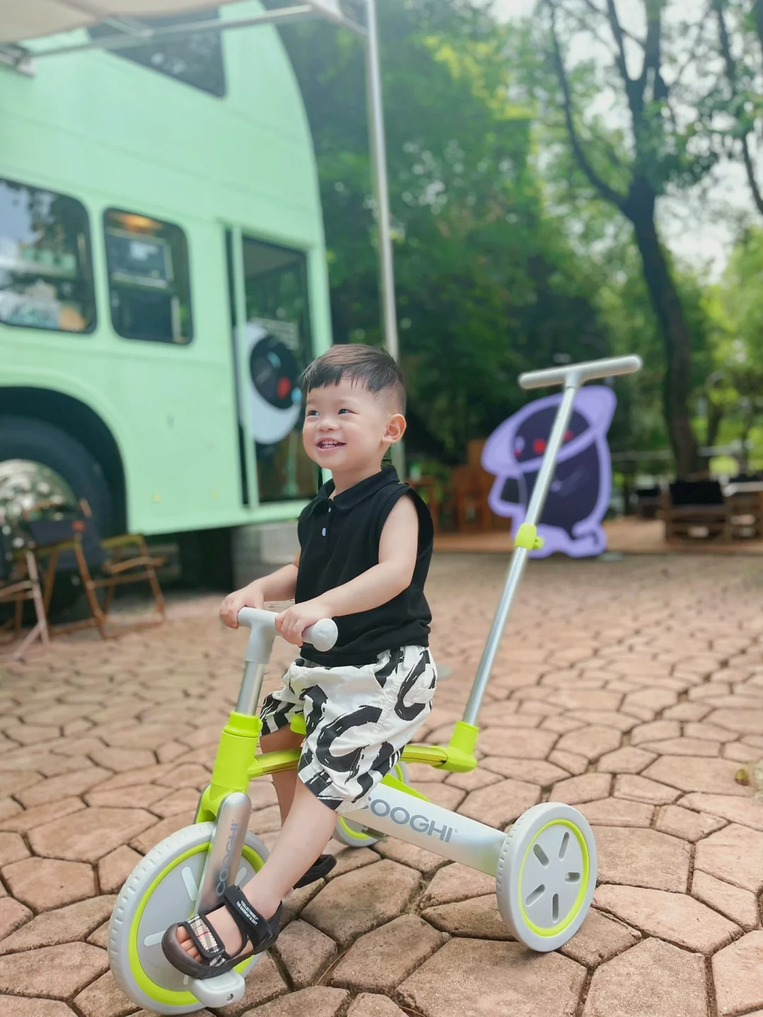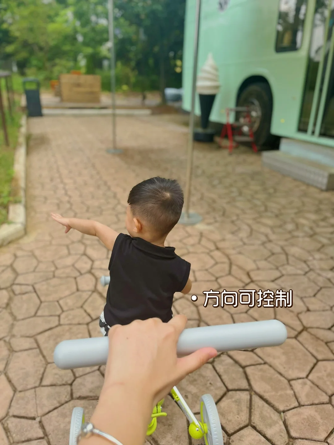 他的遛娃车也变成了可推的三轮车
