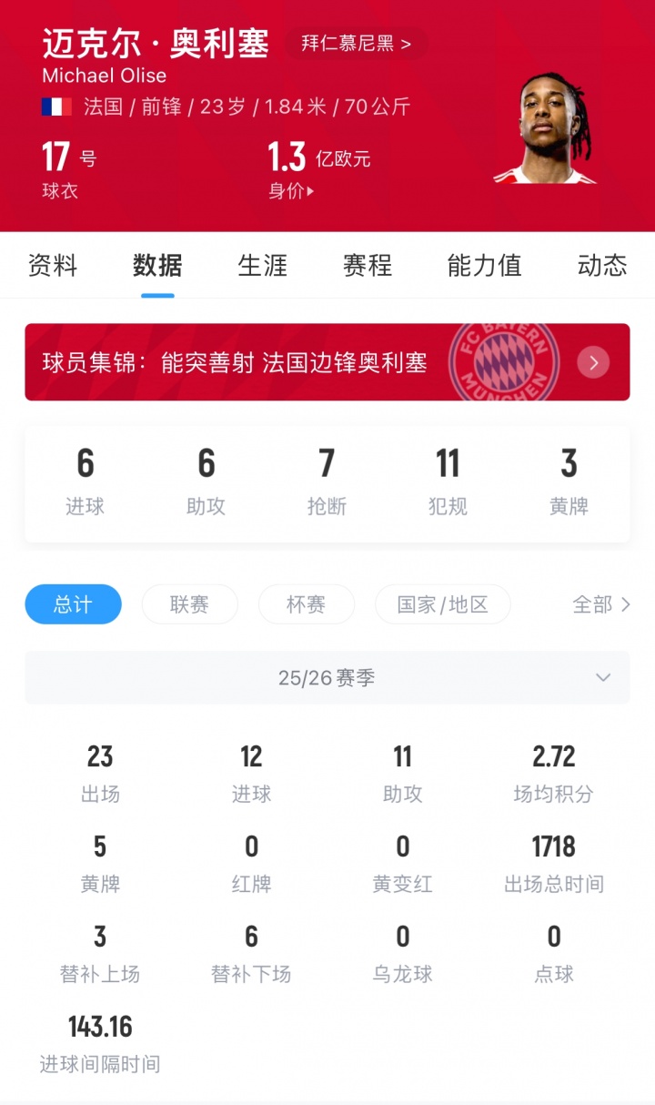 23岁奥利塞本场比赛独造5球,主导了这场大逆转。本赛季,奥利塞为拜仁出场23次,已贡献12球11助攻,效率极高。