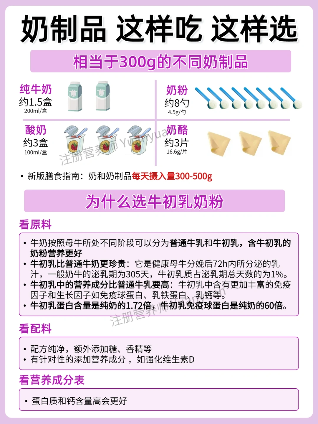 选奶制品的时候大家要看配料表,尽量避免含有香精和糖的产品;另外看配料表中是否含“牛初乳”!这是非常重要的,因为牛初乳中含有的免疫球蛋白,比普通蛋白质更能让我们的体质好💪!我逛了很多超市,好像市面上的纯牛奶里面都没有这个成分!喝奶粉也是可以的!