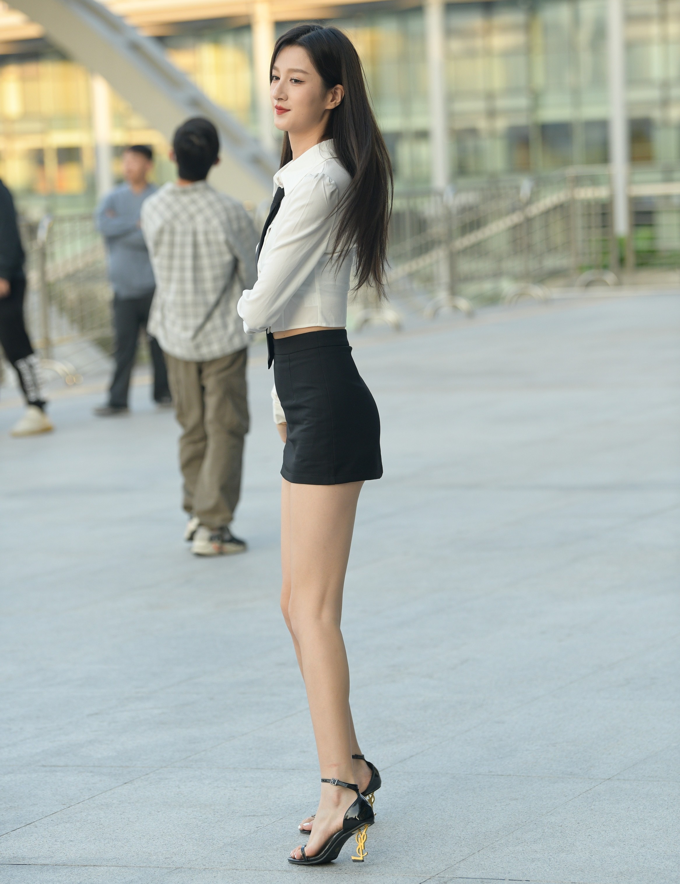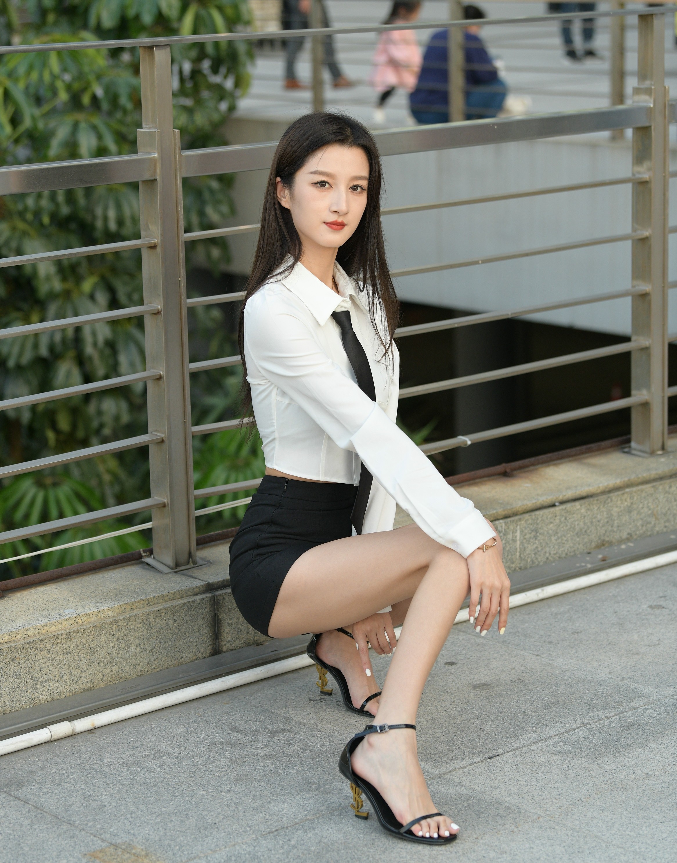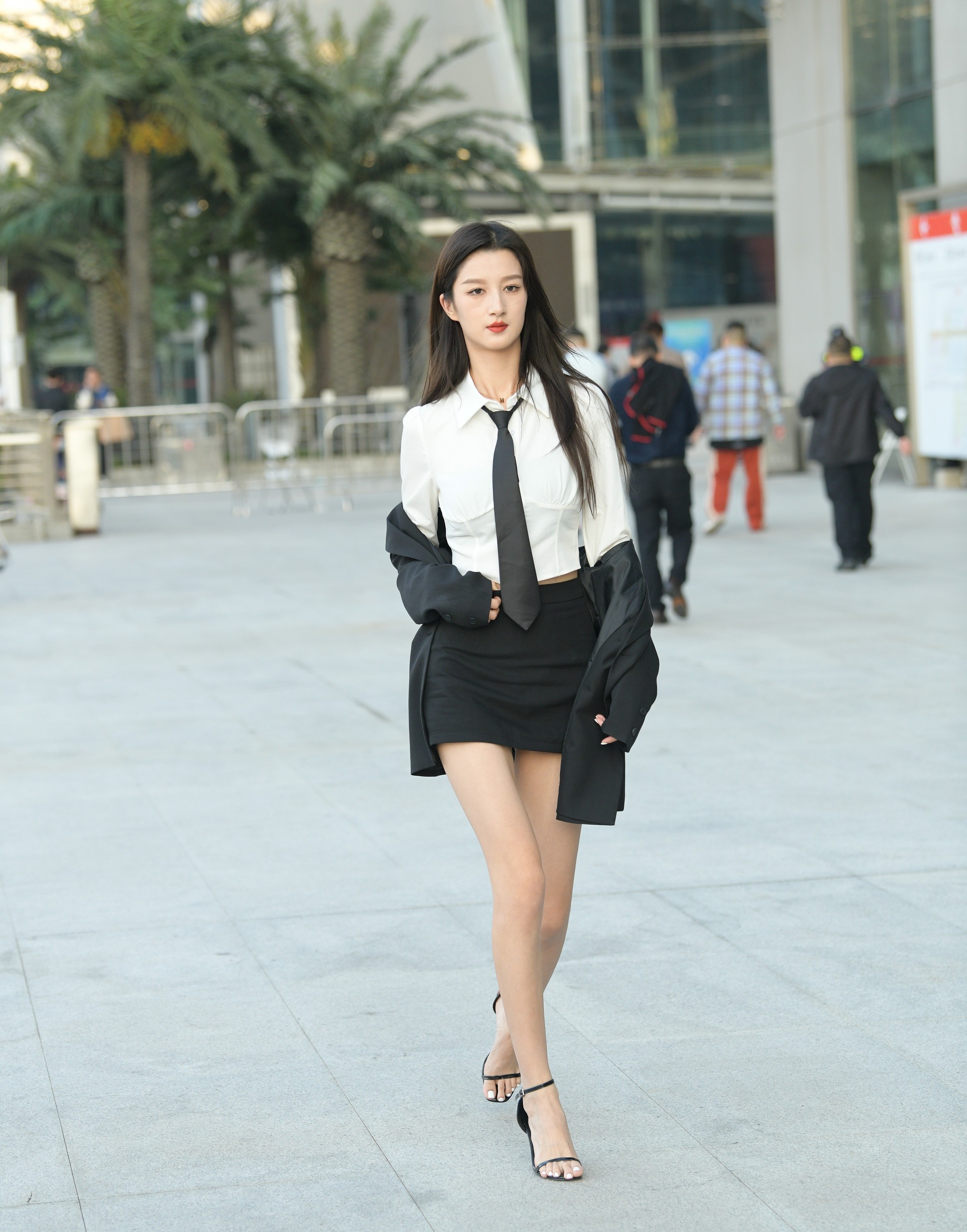 看到小姐姐这组穿搭,是不是瞬间被她的职场辣妹风所吸引?白色短款衬衫,搭配黑色领带,干练中透露出丝丝性感。黑色短裙与高跟凉鞋的组合,更是将她的修长美腿展现得淋漓尽致。