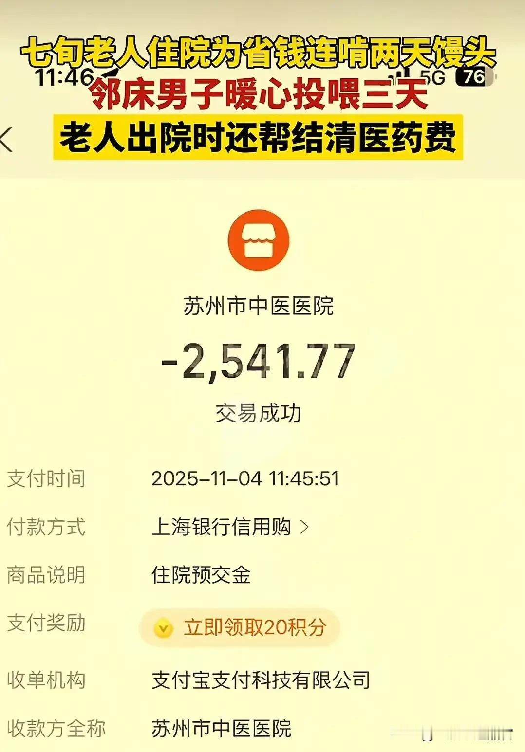 江苏苏州icon,七旬老人住院,为了省钱,连啃两天馒头!邻床小伙看到后,心里满是同情。于是多点了一份外卖,谎称外卖送多了。而接下来小伙的做法, 让老人哽咽流泪!网友:给老人买几顿饭我做的到,但是给老人结清医药费, 我是绝对做不到! 这个故事令人感动,也引发了很多人的思考。邻床的小伙子为了表达关心和善意,选择了用谎言和行动来帮助那位七旬老人,最终的举动让老人感动得流泪。这不仅展现了人性中的善良,也让我们反思在面对他人困难时,自己可以做些什么。 网友的评论也反映出不同的观点: 有人觉得,买几顿饭虽然可以缓解老人暂时的困境,但医药费的负担则是另一回事,自己能力有限,难以承担。 也有人认为,善意的帮助不一定非得大笔资金,哪怕是陪伴、鼓励或是小小的善举,都能带来温暖。 这件事情提醒我们: 关心他人,不一定要付出巨大代价,真诚的行动和关怀就已经很珍贵。 社会需要更多像这位小伙子一样有善心的人,共同营造温暖的环境。 对于困难中的老人,社会和家庭的支持都非常重要,除了个人的善意,也希望有更多的制度保障和帮助。 如果你愿意,可以分享你的看法或想法,或者讨论我们还能做些什么来帮助像这位老人一样需要帮助的人。苏州照顾老人 中老年人点外卖