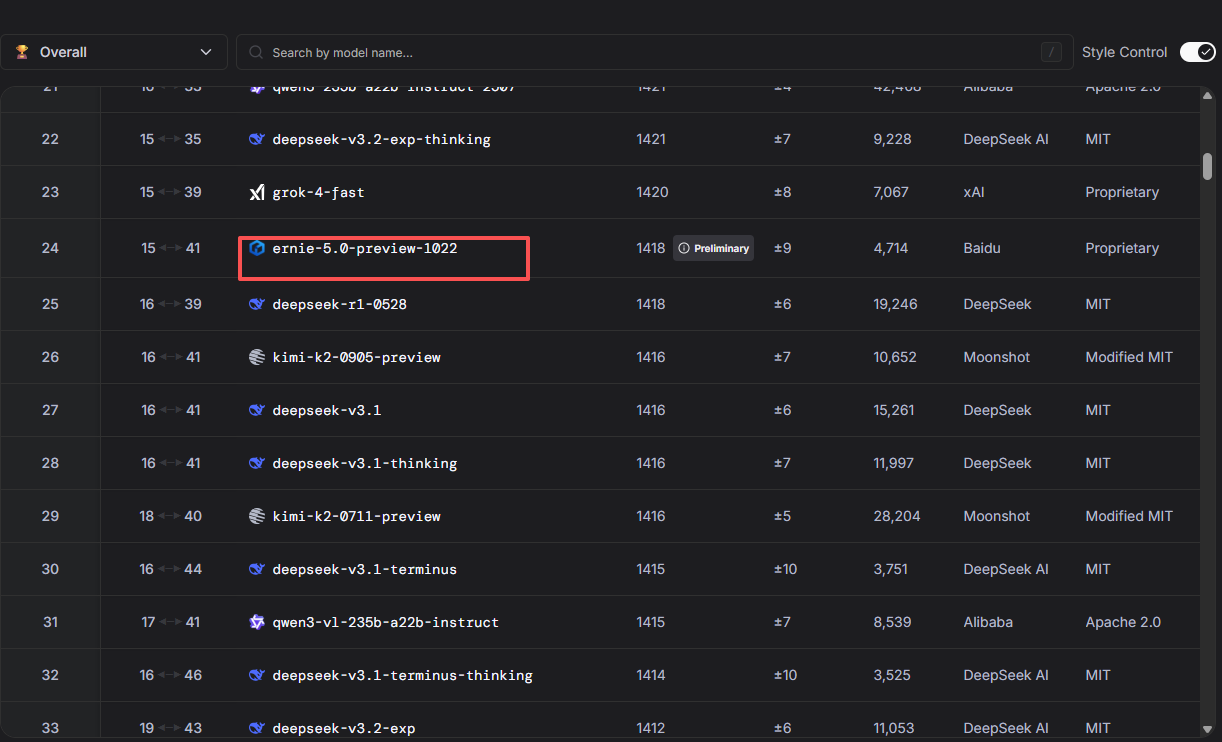 但在2025年11月21日的LMArena排行榜中,百度的文心一言5.0就排到了第24的位置。同时,其也不再是国内第一,阿里旗下的qwen3-max-preview、DeepSeek旗下的deepseek-v3.2-exp-thinking等大模型均排在其前面。