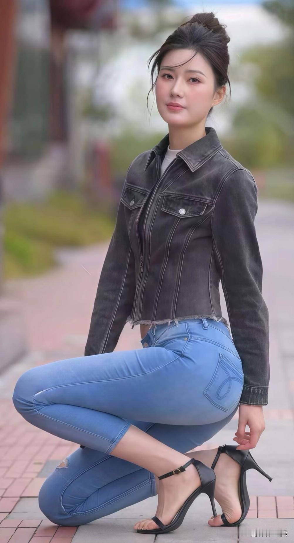 长发妹子穿紧身牛仔裤逛街。