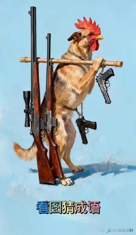 有网友发来私信 有这么张 鸡头 狗身 用根棍子 前面挂手枪 后边挂步枪 说听说你很能成语 还深赌你三天猜不来 这两天我搜肠刮肚,翻遍成语书籍,也没有找到这个图的相应成语 只好厚着脸来求高手指教