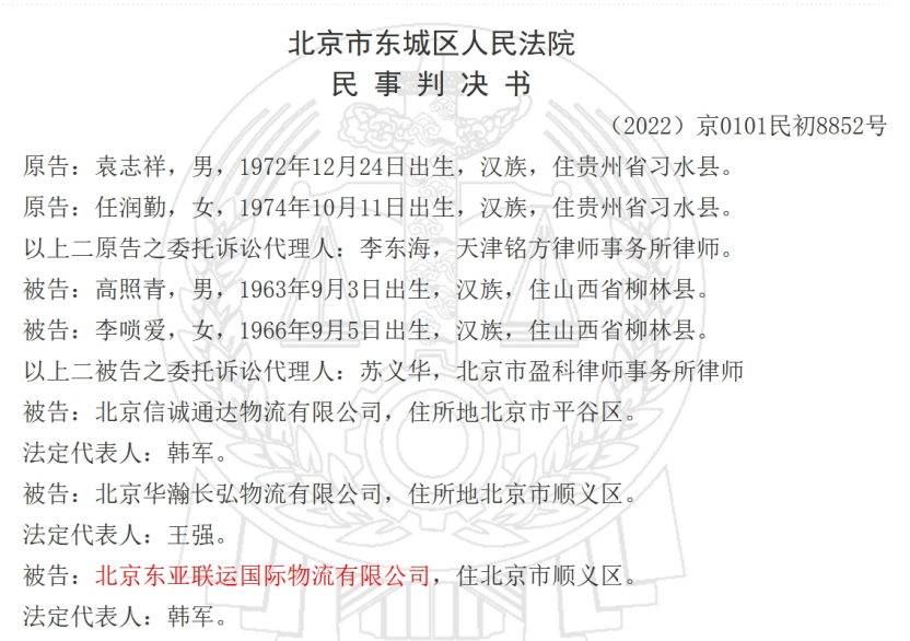 北京信诚通达物流有限公司(下称信诚通达)、北京华瀚长弘物流有限公司(下称华瀚长弘)、北京东亚联运国际物流有限公司(下称北京联运)均为世盟股份的全资子公司。(2022)京0101民初8852号、(2022)京0101民初6616号两份判决文书均为同一个交通事故的两份判决结果,事故经过如下: