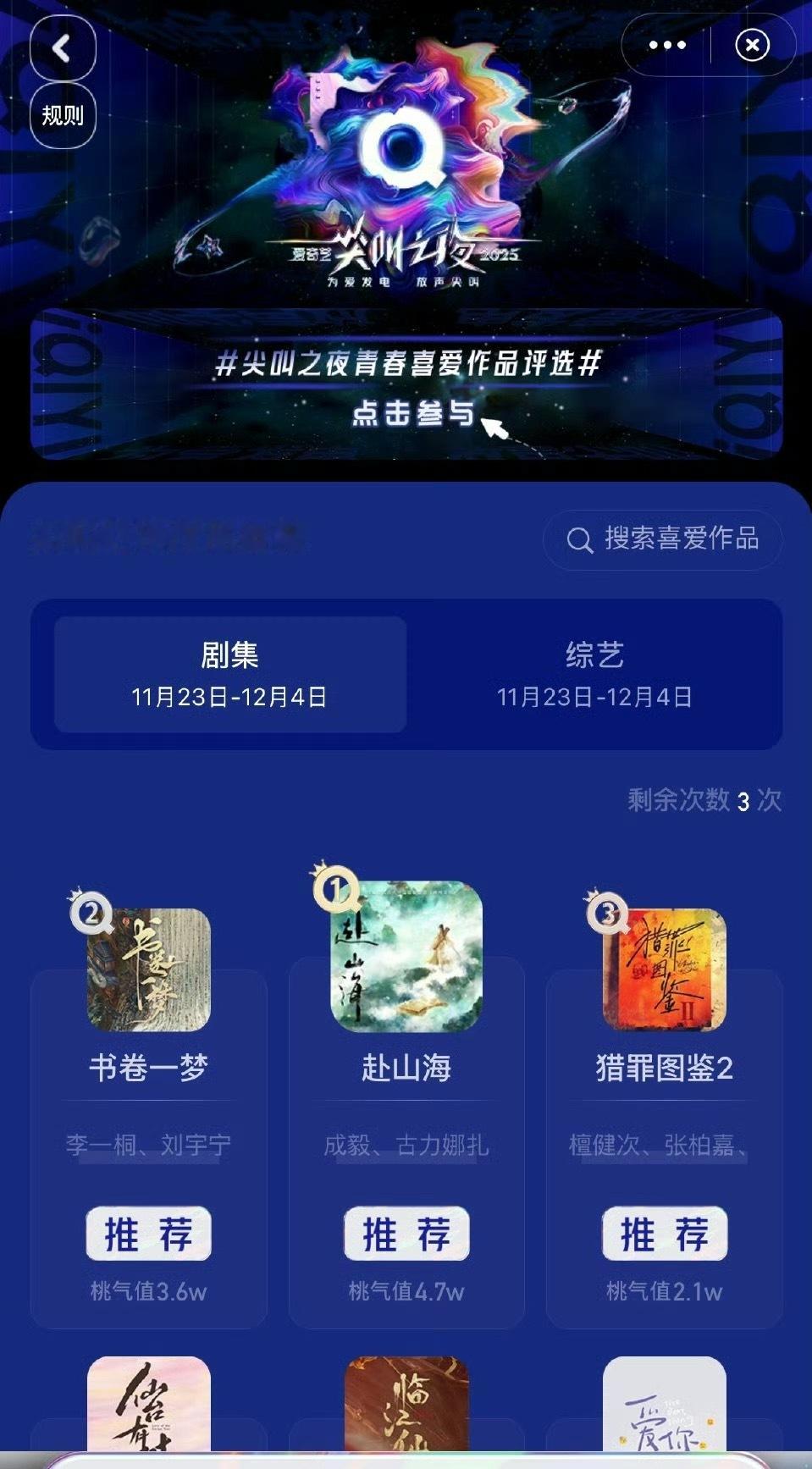 桃尖叫之夜网友喜爱作品评选开始,目前成毅赴山海登顶尖叫之夜青春喜爱作品推荐剧集TOP1📺
